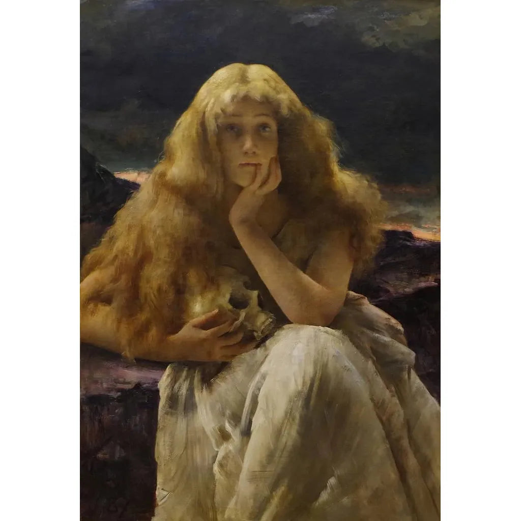 Die kunstdruck von Marie Madeleine von Alfred Stevens fängt die Essenz einer Frau ein, die von tiefen Emotionen geprägt ist. Die zarte Komposition hebt die Schönheit ihres Gesichts hervor, das von einem sanften Licht erleuchtet wird und ihre Züge betont. Die warmen Farben, die Nuancen von Rot und Gold vermischen, schaffen eine intime und kontemplative Atmosphäre. Die Technik von Stevens, die Realismus und Romantik verbindet, ermöglicht es, die Tiefe der Seele von Marie Madeleine zu spüren, während gleichzeitig eine gewisse Melancholie evoziert wird. Dieses Gemälde, eine wahre Ode an die Weiblichkeit, lädt zur Reflexion über die menschliche Natur und die Suche nach Erlösung ein.