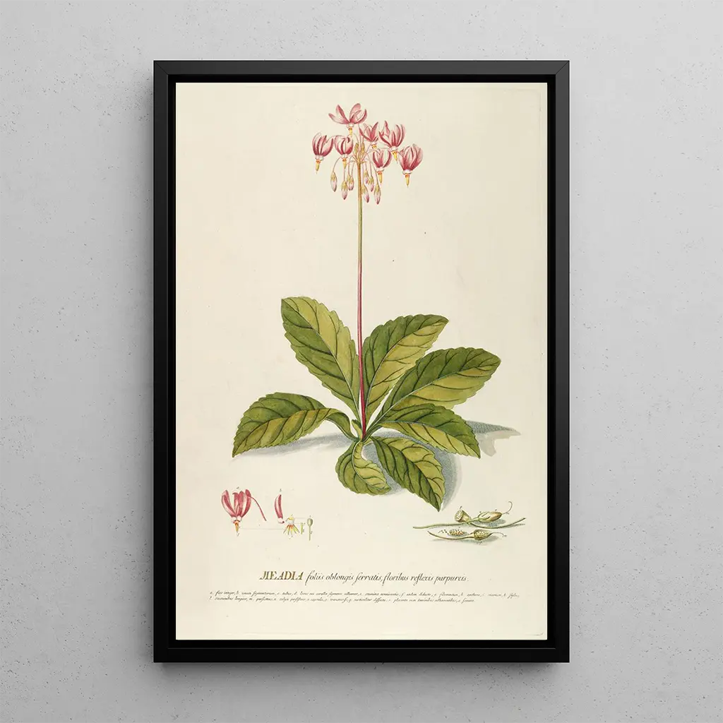 Meadia ist ein Kunstdruck von Georg Dionysius Ehret und ist eine wahre Hommage an die florale Vielfalt. Dieses Werk, das mit bemerkenswerter botanischer Präzision geschaffen wurde, zeigt lebendige Blumen in leuchtenden Farben. Die Nuancen von Grün und Rosa verschmelzen harmonisch und schaffen eine Atmosphäre der Gelassenheit und des Staunens. Die Aquarelltechnik, die mit Feinfühligkeit angewendet wird, fängt die Zartheit der Blütenblätter und die Helligkeit der Blätter ein und lädt den Betrachter ein, in eine Welt einzutauchen, in der die Natur Königin ist. Jedes Detail ist sorgfältig wiedergegeben und zeugt von einer tiefen Liebe zur Pflanzenwelt.