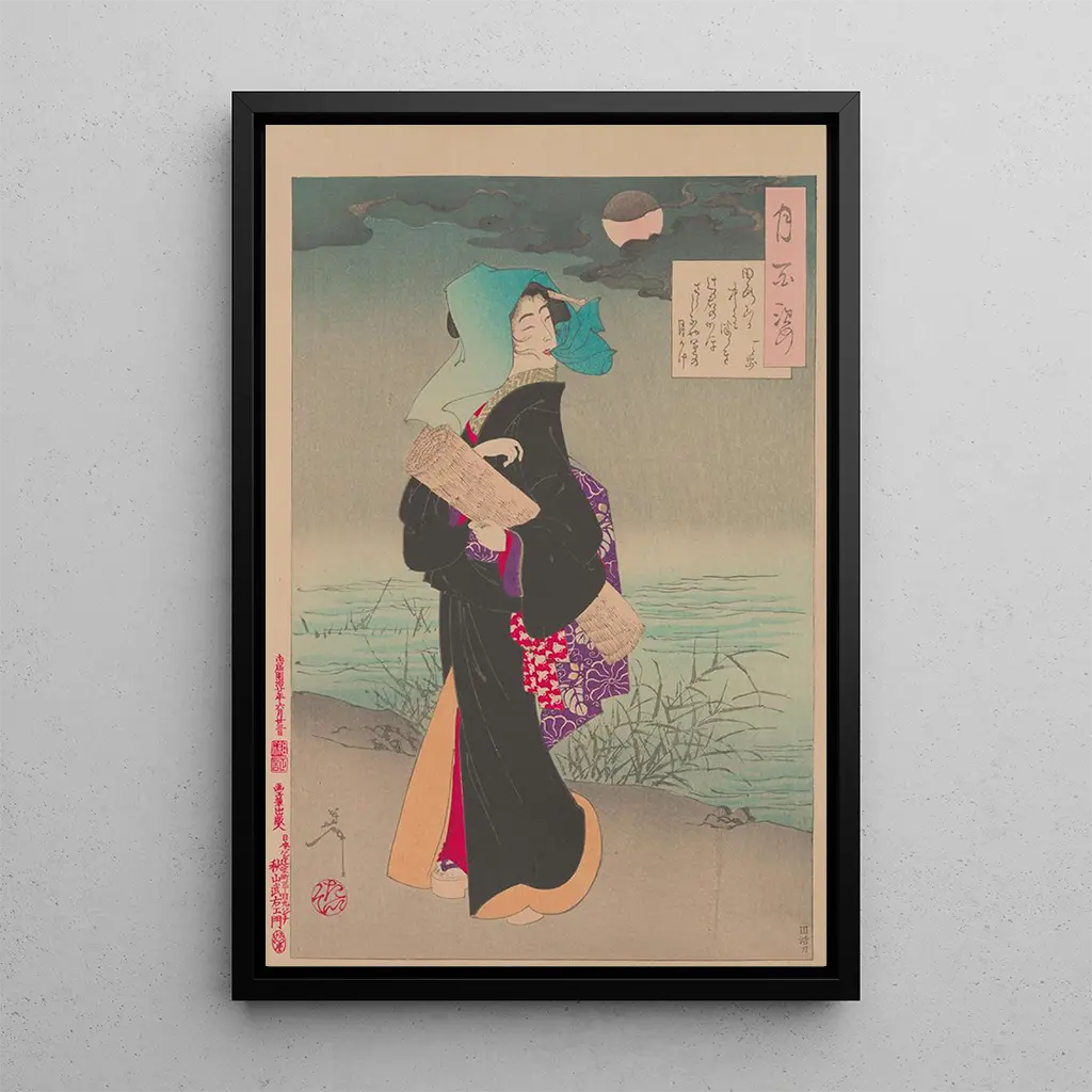 Dans cette œuvre captivante, Tsukioka Yoshitoshi nous plonge dans une atmosphère nocturne empreinte de mystère. La composition met en avant une femme élégante, vêtue d'un kimono délicat, se déplaçant avec grâce sous la lueur argentée de la lune. Les couleurs sombres du ciel contrastent avec les teintes lumineuses de son vêtement, créant une harmonie visuelle saisissante. La technique de l'estampe ukiyo-e, caractéristique de l'art japonais, permet de capturer la fluidité des mouvements et la délicatesse des détails, rendant cette reproduction du tableau Promeneuse de nuit au clair de lune particulièrement envoûtante.