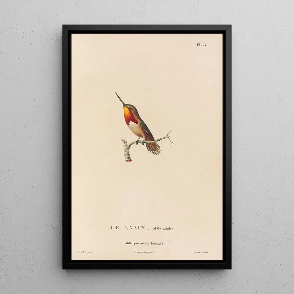 Die reproduction Histoire naturelle des oiseaux-mouches Pl67 ist ein lebendiges Kunstwerk, das die Schönheit und Vielfalt der Vögel mit Flügeln feiert. Die leuchtenden Farben, die von Smaragdgrün bis zu hellen Gelbtönen reichen, verschmelzen harmonisch, um eine lebendige und fröhliche Atmosphäre zu schaffen. Die Gravurtechnik, die von René Primevère Lesson verwendet wird, ermöglicht es, die feinen Details der Federn und die Posturen der Vögel präzise einzufangen. Jedes Element der Komposition scheint zum Leben zu erwachen und lädt den Betrachter ein, in eine Welt einzutauchen, in der die Natur mit unendlicher Anmut Ausdruck findet.