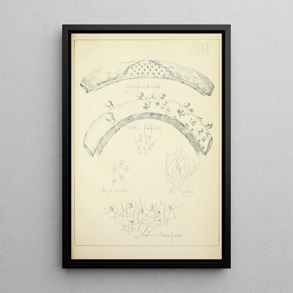 Die reproduction Geschichte der Naturkunde der Pilze Pl75 von Guillaume Sicard entführt uns in eine mysteriöse und zarte Welt. Dieses Werk, reich an Details, hebt eine Palette erdiger Farben hervor, die von tiefen Brauntönen bis zu leuchtenden Grüntönen reicht und die Vielfalt der Pilze widerspiegelt. Die Technik von Sicard, die Aquarell und Zeichnung kombiniert, verleiht jedem Pilz eine fast tastbare Textur und lädt den Betrachter ein, sich zu nähern und zu beobachten. Die Atmosphäre, die von diesem Gemälde ausgeht, ist sowohl beruhigend als auch faszinierend, wie ein Spaziergang durch einen verzauberten Wald, in dem jede Art eine Geschichte erzählt.