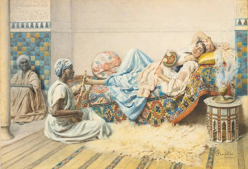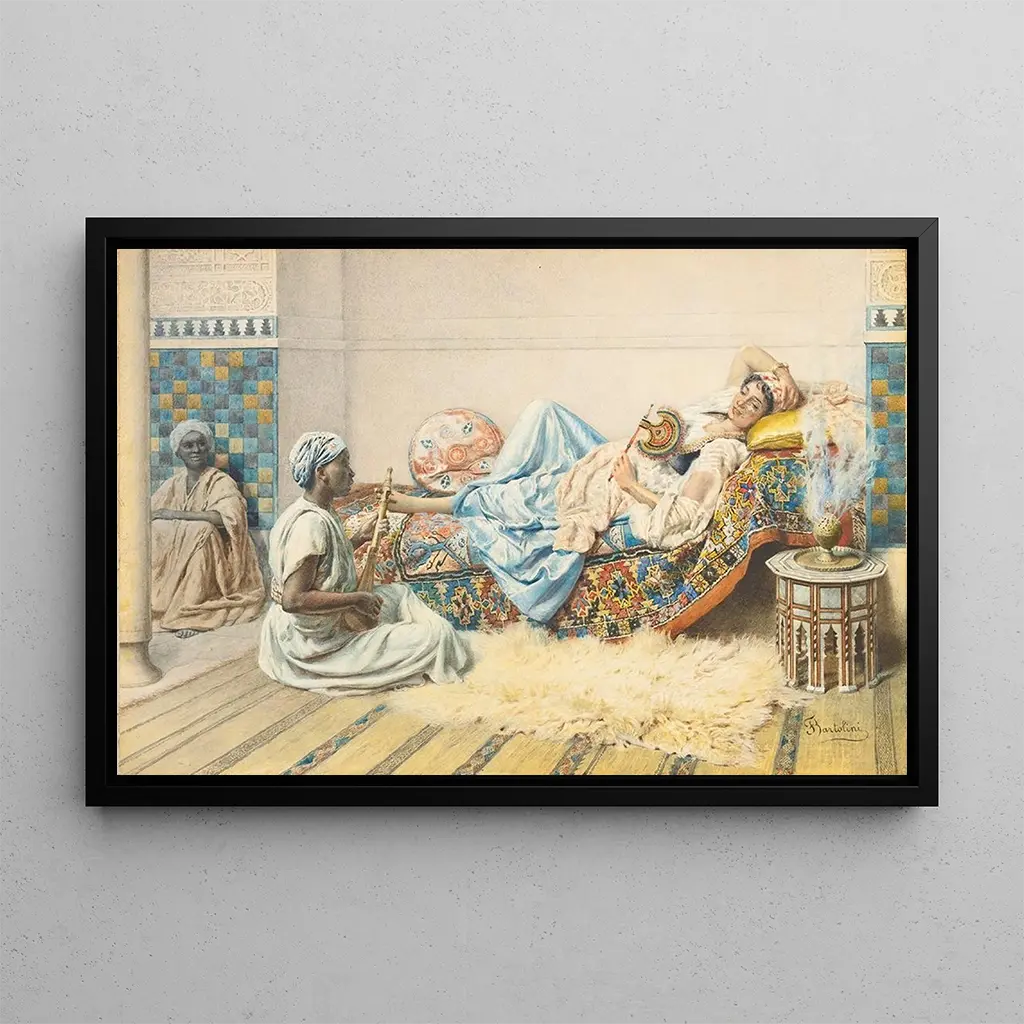 L'Odalisque : eine sinnliche Vision des Orients L'Odalisque, ein ikonisches Werk von Federico Bartolini, evoziert eine zarte Sinnlichkeit und einen Traum vom Orient. Die Komposition zeigt eine liegende Frau, umgeben von prächtigen Drapierungen und exotischen Mustern. Die reichen Farben, die von warmen Tönen bis zu tiefen Nuancen reichen, schaffen eine intime und geheimnisvolle Atmosphäre. Die Technik von Bartolini, gekennzeichnet durch fließende Pinselstriche und eine besondere Liebe zum Detail, erweckt diese weibliche Figur zum Leben und vermittelt gleichzeitig ein Gefühl von Ruhe und Gelassenheit. Dieses Gemälde lädt zur Betrachtung und Flucht in eine Welt voller Schönheit ein. Federico Bartolini: ein Künstler des XIX. Jahrhunderts Federico Bartolini, aktiv im 19. Jahrhundert, ist ein italienischer Maler, dessen Werk im romantischen Stil verankert ist. Beeinflusst von den künstlerischen Strömungen seiner Zeit, integrierte er orientalistische Elemente in seine Werke, die eine Faszination für den Orient und seine Geheimnisse widerspiegeln. Bartolini wurde an italienischen Akademien ausgebildet, wo er einen persönlichen Stil entwickelte, der Realismus und Idealisierung verbindet. L'Odalisque ist eines seiner bekanntesten Werke und zeugt von seiner Fähigkeit, die weibliche Schönheit einzufangen und exotische Atmosphären zu beschreiben, während er sich im künstlerischen Kontext seiner Epoche bewegt. Eine dekorative Anschaffung mit vielfältigen Vorzügen Die Reproduktion von L'Odalisque ist eine perfekte Wahl, um Ihre Inneneinrichtung zu bereichern. Ob im Wohnzimmer, Schlafzimmer oder Büro – dieses Bild verleiht Eleganz und Geheimnis. Die Qualität der Reproduktion garantiert eine Treue zu den Farben und Details des Originalwerks und bietet gleichzeitig eine unbestreitbare ästhetische Anziehungskraft. Durch die Integration dieses Kunstwerks in Ihren Raum schaffen Sie eine raffinierte und fesselnde Atmosphäre und würdigen gleichzeitig die romantische Kunst des 19. Jahrhunderts.
