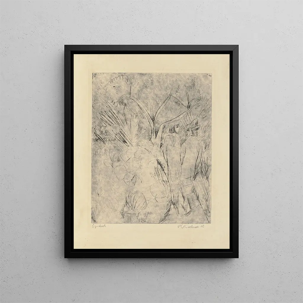 Reproduktion Paar, das im Garten spaziert - Ernst Ludwig Kirchner – Fesselnde Einführung In der vielfältigen Welt der modernen Kunst hebt sich das Werk "Paar, das im Garten spaziert" von Ernst Ludwig Kirchner durch seine Sensibilität und seinen Mut hervor. Dieses Gemälde, lebendig voller Farben und Emotionen, taucht uns in einen schwebe Moment ein, in dem Natur und Menschlichkeit in einem zarten Tanz aufeinandertreffen. Kirchner, eine ikonische Figur des deutschen Expressionismus, gelingt es, das Wesen eines intimen Moments einzufangen und den Betrachter einzuladen, die Nuancen menschlicher Beziehungen und die Schönheit der natürlichen Welt zu erkunden. Die Szene, von Leichtigkeit geprägt, erinnert an einen ruhigen Spaziergang, während sie gleichzeitig eine psychologische Tiefe offenbart, die zum Nachdenken anregt. Stil und Einzigartigkeit des Werks Der Stil von Kirchner zeichnet sich durch eine mutige Farbpalette und stilisierte Formen aus, die seinen Werken eine fast greifbare Energie verleihen. In "Paar, das im Garten spaziert" schaffen die lebendigen und kontrastreichen Farben eine fröhliche Atmosphäre, während die fließenden Linien und die vereinfachten Silhouetten der Figuren eine Harmonie zwischen Mensch und Natur vermitteln. Der Künstler verwendet expressive Pinselstriche und dynamische Kompositionen, um ein Gefühl von Bewegung zu vermitteln, als ob die Figuren im üppigen Garten aufblühen. Dieses Werk beschränkt sich nicht darauf, eine Alltagsszene darzustellen; es transzendiert die Realität, um eine poetische und subjektive Vision zu bieten, bei der jedes Element voller Bedeutung ist. Der Garten, Ort des Treffens und der Zuflucht, wird zum Symbol einer Suche nach Authentizität und Schönheit. Der Künstler und sein Einfluss Ernst Ludwig Kirchner, geboren 1880 in Deutschland, ist einer der Gründer der Gruppe Die Brücke, die eine bedeutende Rolle bei der Entwicklung des Expressionismus spielte. Sein Werk speist sich aus seinen persönlichen Erfahrungen, seinen Reisen und seinem Engagement für eine innovative künstlerische Vision. Kirchner verstand es, die Spannungen seiner Zeit einzufangen, zwischen Moderne und Tradition schwebend, und erforschte die Themen Isolation und menschliche Verbindung. Sein Einfluss reicht über seine Epoche hinaus und inspiriert zahlreiche zeitgenössische und zukünftige Künstler, die in ihm einen Vorläufer der modernen Kunst sehen. Durch seine Gemälde, er
