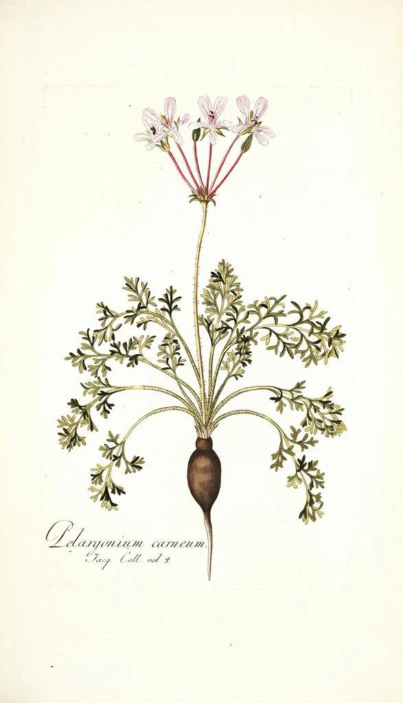 Nikolaus Joseph Freiherr von Jacquin gilt als einer der Pioniere der botanischen Illustration im 18. Jahrhundert. Seine vertieften Studien und Reisen ermöglichten es ihm, eine Vielzahl von Pflanzen zu entdecken und zu dokumentieren, darunter den Pelargonium carneum. Beeinflusst von den wissenschaftlichen Strömungen seiner Zeit, verstand Jacquin es, Kunst und Wissenschaft zu verbinden, wodurch seine Werke nicht nur ästhetisch, sondern auch lehrreich sind. Seine Arbeit hat einen nachhaltigen Einfluss auf die Botanik und die Kunst gehabt und macht ihn zu einer ikonischen Figur in beiden Bereichen.