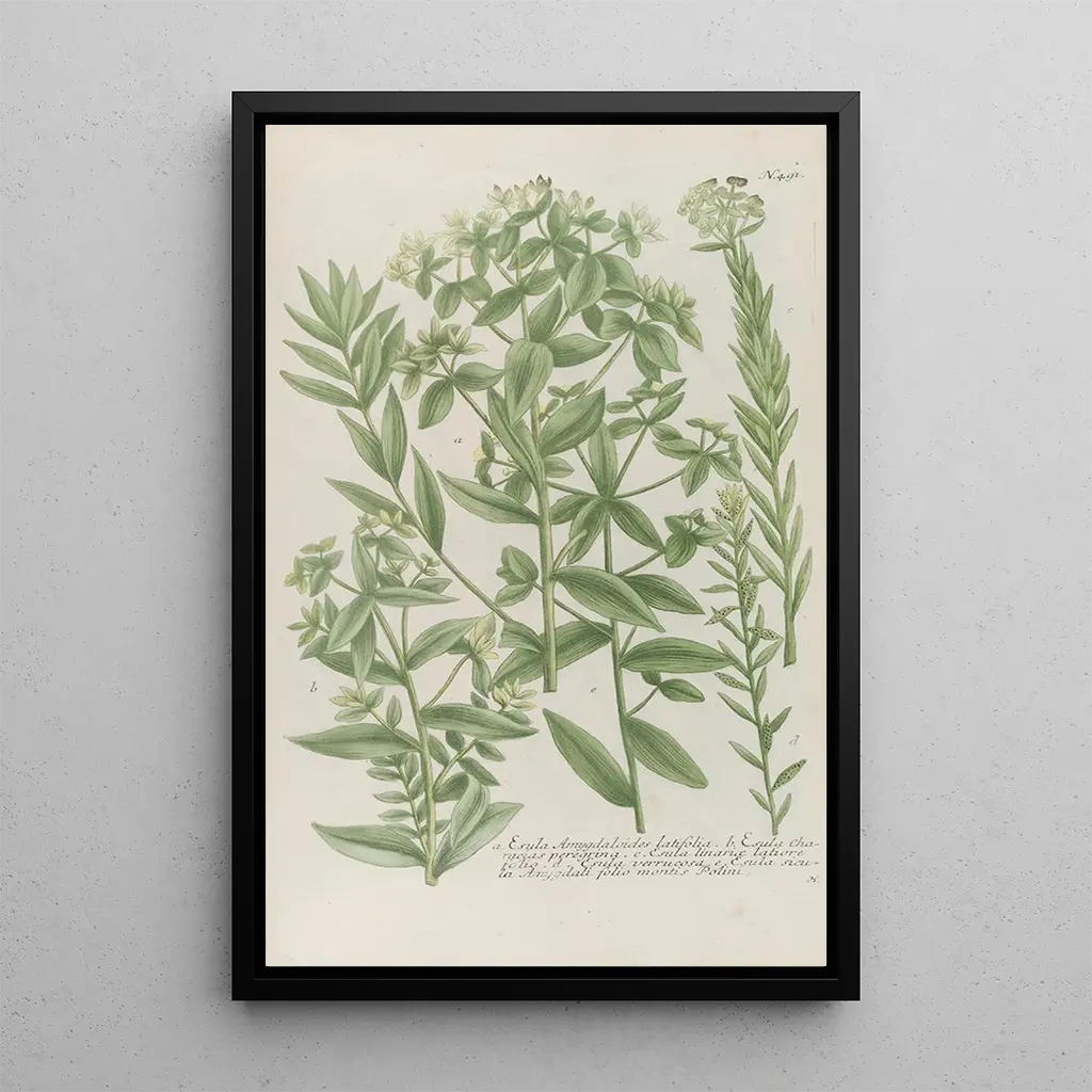 Die kunstdruck der Arbeit Phytanthoza iconographia Pl214 entführt uns in eine reiche und farbenfrohe Pflanzenwelt. Die detaillierten Darstellungen der Pflanzen, meisterhaft wiedergegeben, offenbaren eine Palette lebendiger Farben, die von leuchtendem Grün bis zu zarten Nuancen von Rosa und Gelb reicht. Die Gravurtechnik, kombiniert mit einer subtilen Aquarelltechnik, schafft eine Atmosphäre, die sowohl wissenschaftlich als auch poetisch ist und den Betrachter einlädt, die Schönheit der Natur zu erkunden. Jedes Element ist sorgfältig arrangiert und bietet eine harmonische Komposition, die den Blick anzieht und die Fantasie anregt.