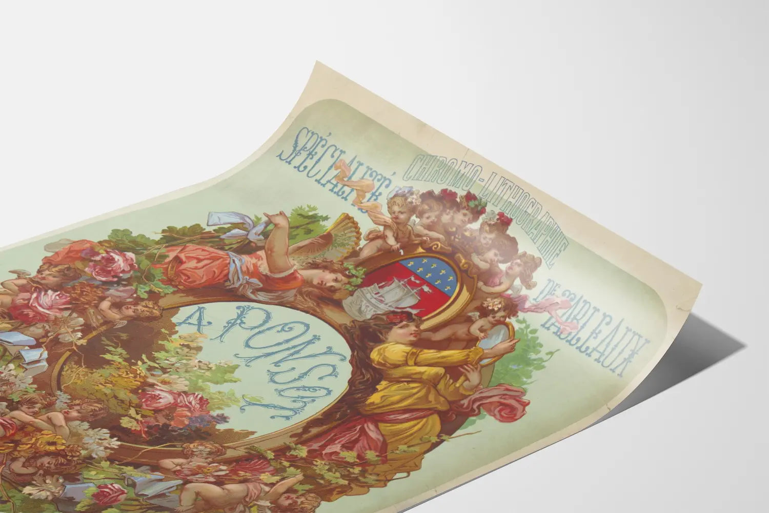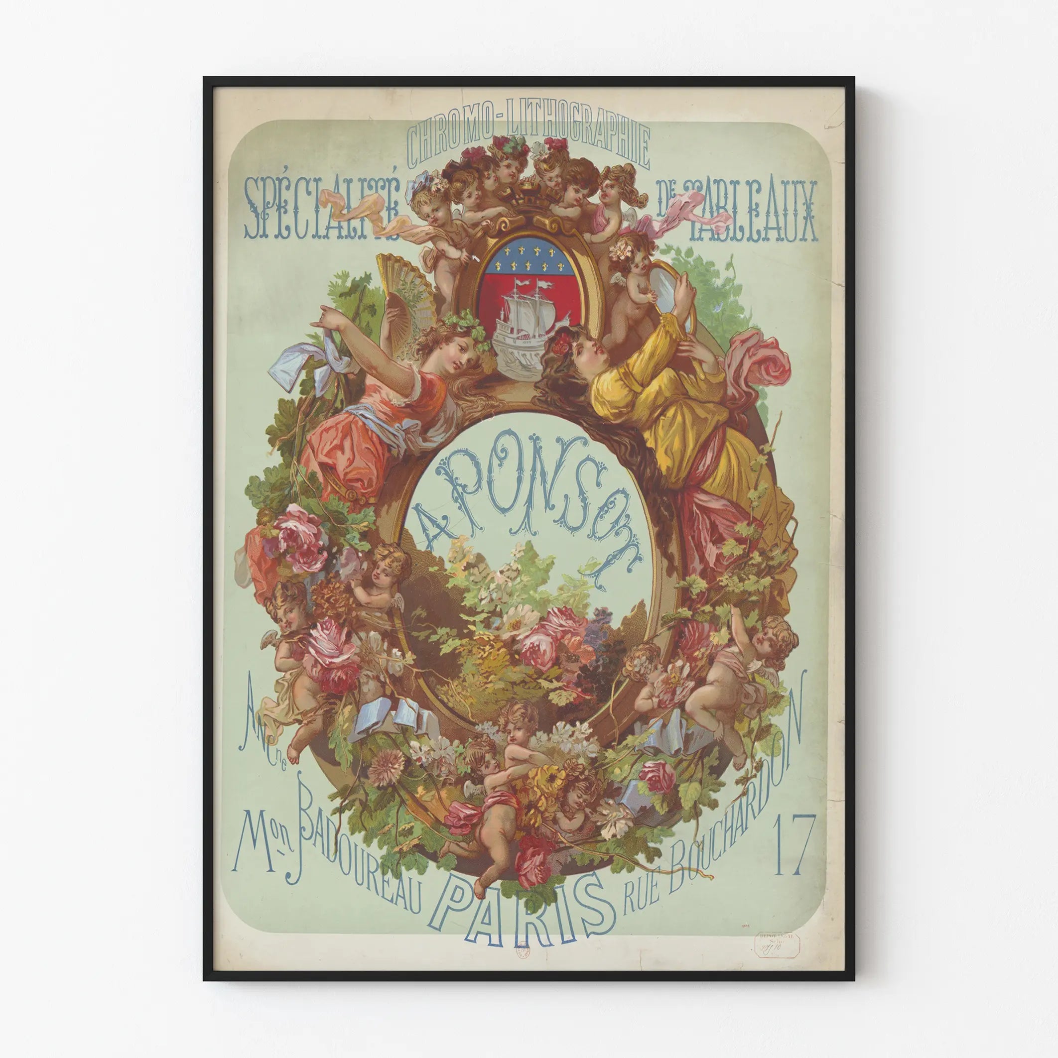 Dieses chromolithografische Vintage-Poster zeigt eine künstlerische Werbung für die Spezialität der Gemälde von Ponsot, einem alten Haus Badoureau in Paris, Rue Bouchardon 17. Mit einem dekorativen Stil des späten 19. Jahrhunderts bis Anfang des 20. Jahrhunderts ist dieses Wandbild mit einem ovalen Rahmen geschmückt, der mit Blumen, Blättern und zahlreichen Engeln verziert ist, die spielen und den Mittelpunkt mit dem Namen „APONSON“ umgeben. Oben sind die Worte „CHROMOLITHOGRAPHIE“ und „GEMÄLDESPZIALITÄT“ in stilisierten Buchstaben geschrieben, typisch für alte Plakate dieser Epoche. Ein Wappen mit einem Schiff befindet sich an der Spitze des Rahmens und verleiht diesem dekorativen Poster eine symbolische Note. Die sanften Pastellfarben, kombiniert mit kräftigeren Tönen für die Figuren und die Vegetation, verleihen diesem Bild eine elegante und nostalgische Atmosphäre. Dieses Wanddekorationstück ist ideal für Liebhaber von Retro-Kunst, alten Chromolithografien oder künstlerischen Werbeplakaten. Sein einzigartiger Stil und sein ornamentaler Charakter machen es zu einem raffinierten und authentischen Wanddekorationselement, das in einem klassischen oder eklektischen Interieur aufgehängt werden kann. Dieses alte Poster bringt einen Hauch visueller Geschichte und traditioneller Grafik-Kunst, die eine spezielle chromolithografische Handwerkskunst aus Paris hervorhebt.