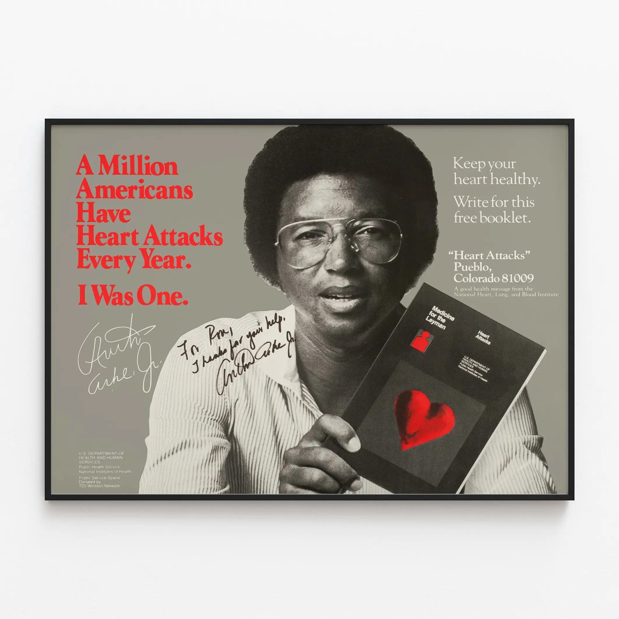 Dieses Vintage-Poster zur Sensibilisierung für Herzkrankheiten lenkt die Aufmerksamkeit auf eine entscheidende öffentliche Gesundheitsbotschaft: Jährlich erleiden eine Million Amerikaner einen Herzinfarkt. Das Bild zeigt ein Schwarz-Weiß-Porträt eines Mannes mit Brille, der ein Heft mit dem Titel „Medizin für Laien“ hält, das sich mit Herzinfarkten beschäftigt. Der leuchtend rote und eindringliche Text „Eine Million Amerikaner erleiden jedes Jahr Herzinfarkte. Ich war einer davon.“ unterstreicht die Schwere des Problems und liefert gleichzeitig eine starke persönliche Aussage.