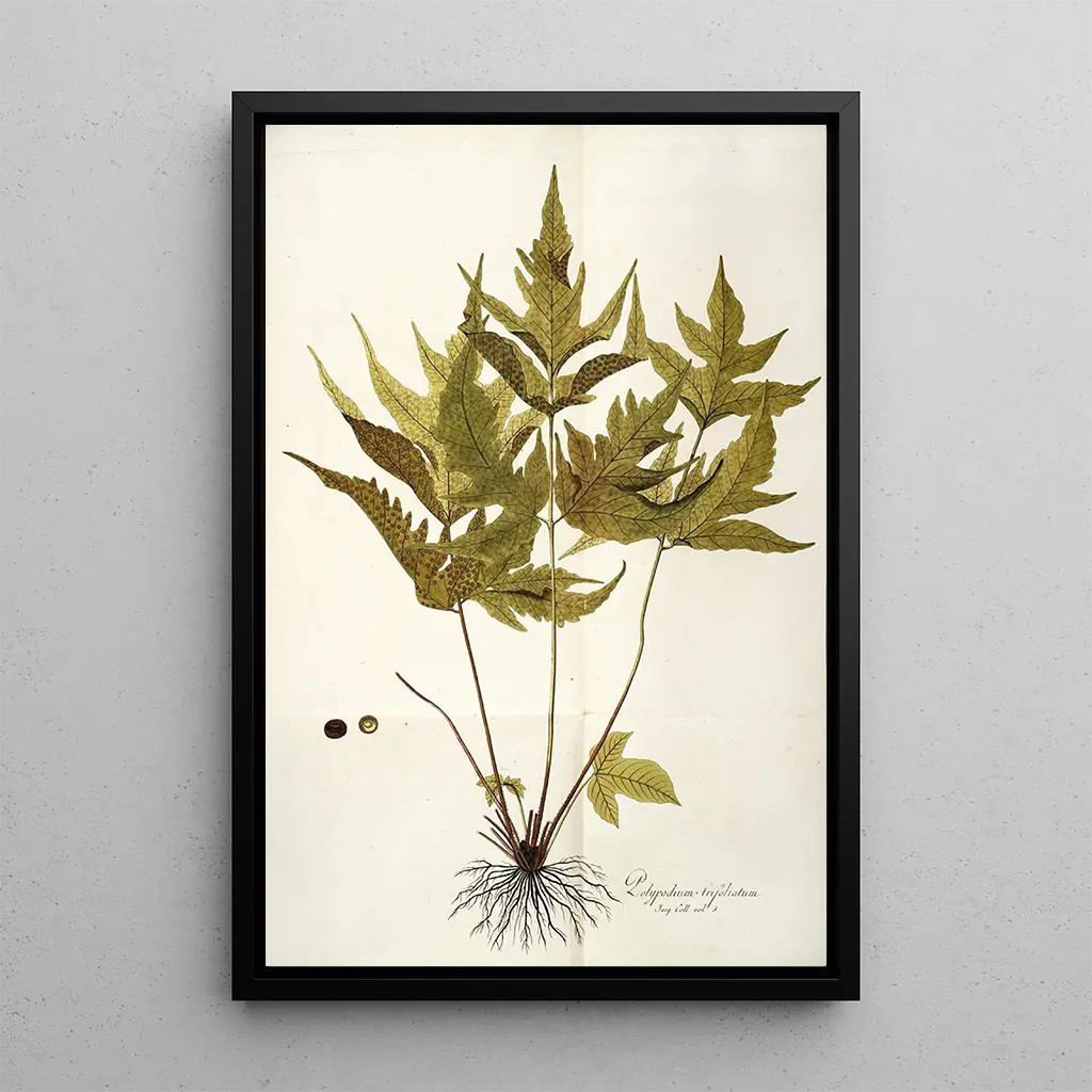 Die kunstdruck von Polypodium trifoliatum entführt uns in eine Welt der Frische und Zartheit. Dieses Werk von Nikolaus Joseph Freiherr von Jacquin präsentiert eine harmonische Komposition, bei der die Grüntöne subtil miteinander verschmelzen. Die Aquarelltechnik, mit ihren fließenden Farbverläufen, schafft eine leichte und luftige Atmosphäre, fast ätherisch. Die detaillierten Darstellungen der Blätter und Stängel zeugen von einem aufmerksamen Blick auf die Natur und laden den Betrachter ein, die Schönheit der organischen Formen zu schätzen. Jeder Pinselstrich scheint einen flüchtigen Moment einzufangen, eine Atemzug der Flora.