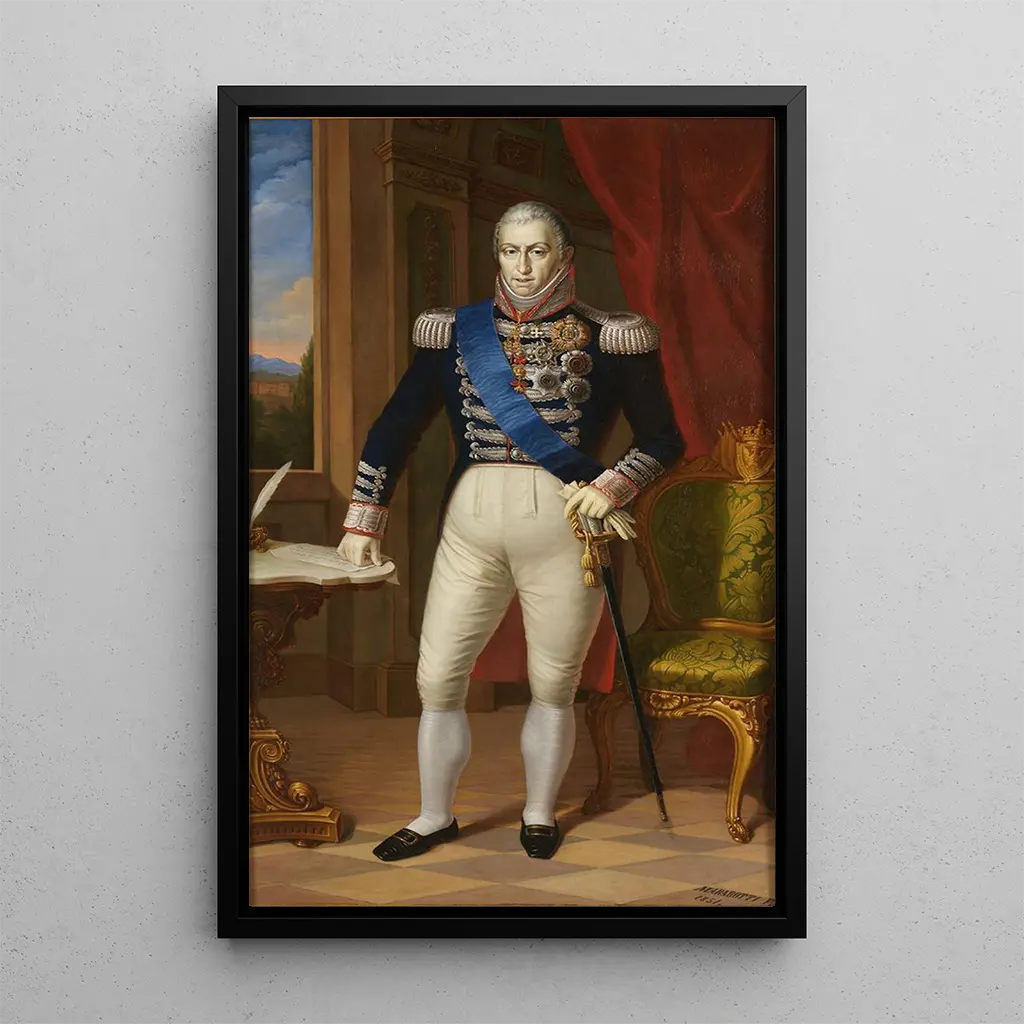 Der kunstdruck des porträts von Carlo Felice ist eine dekorative wahl, die Ihrem Raum eine Note von Raffinesse verleiht. Ob im Büro, im Wohnzimmer oder im Wartezimmer, diese leinwand zieht den Blick auf sich und weckt Bewunderung. Die druckqualität garantiert eine außergewöhnliche detailtreue des Originals, sodass die Schönheit der Farben und Texturen voll zur Geltung kommt. Durch die Integration dieses kunstdrucks in Ihre Dekoration schaffen Sie eine Umgebung, die Kunst und Geschichte feiert, und verleihen Ihrem Interieur gleichzeitig einen Hauch von Prestige.