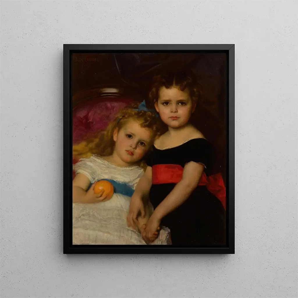 Das "Porträt der beiden Schwestern" von Alexandre Cabanel ist ein ikonisches Werk, das den Rahmen der Malerei übertrifft und zu einer wahren Ode an Schönheit und familiäre Intimität wird. Im 19. Jahrhundert geschaffen, strahlt dieses Gemälde eine sanfte und melancholische Atmosphäre aus, die den Betrachter einlädt, in eine Welt einzutauchen, in der Unschuld und Zärtlichkeit aufeinandertreffen. Die beiden jungen Mädchen, mit einer außergewöhnlichen Feinfühligkeit dargestellt, scheinen ein Geheimnis zu teilen, einen Moment, der im Zeitlosen schwebt, in dem jeder Austausch von Blicken eine Geschichte erzählt. Die technische Meisterschaft Cabanels, sowohl bei der Farbwahl als auch bei der Texturgebung, verleiht diesem Werk eine emotionale Tiefe, die Kunstliebhaber weiterhin fasziniert.