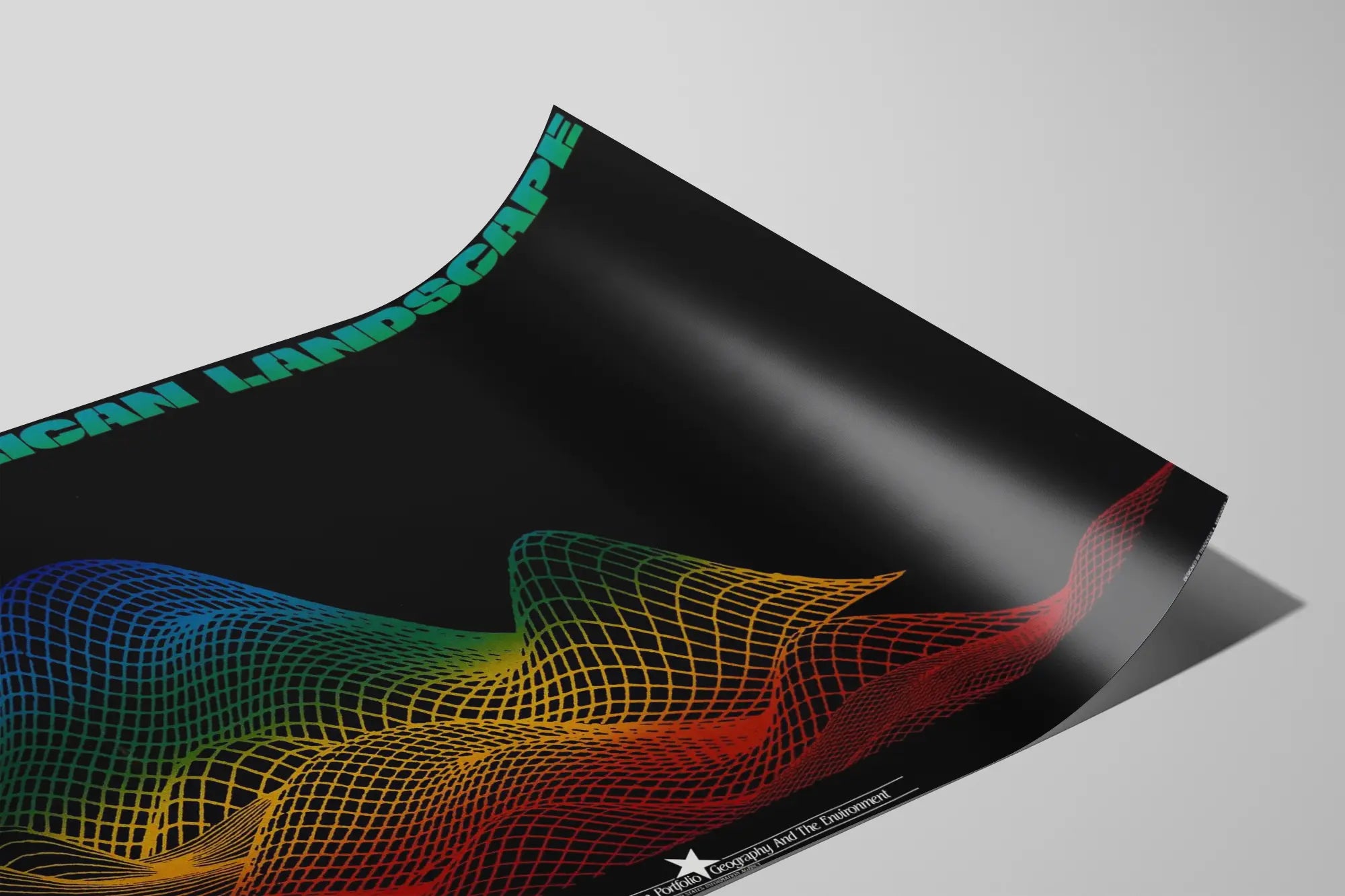 Dieses Poster besticht durch sein minimalistisches und geometrisches Design, das sowohl an Technologie als auch an Natur erinnert und ein harmonisches Gleichgewicht zwischen Abstraktion und Darstellung schafft. Der schwarze Hintergrund verstärkt die Leuchtkraft der Farben und hebt die Gitterstruktur hervor, wodurch Tiefe und Volumen entstehen. Am oberen Rand betont der Schriftzug „THE AMERICAN LANDSCAPE“ in Großbuchstaben und fetter Schriftart die grafische Seite und setzt einen starken typografischen Akzent, der die Komposition abrundet.