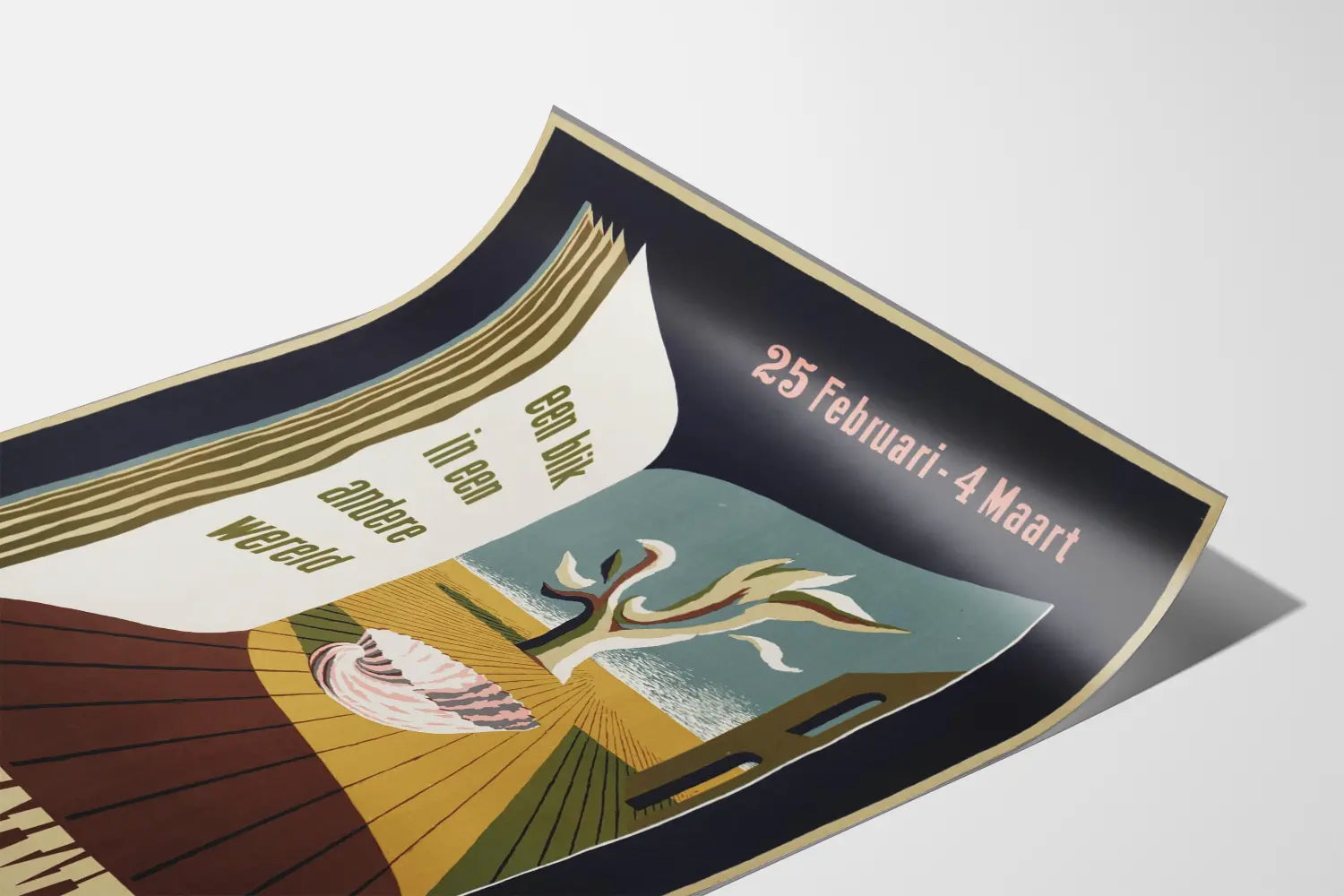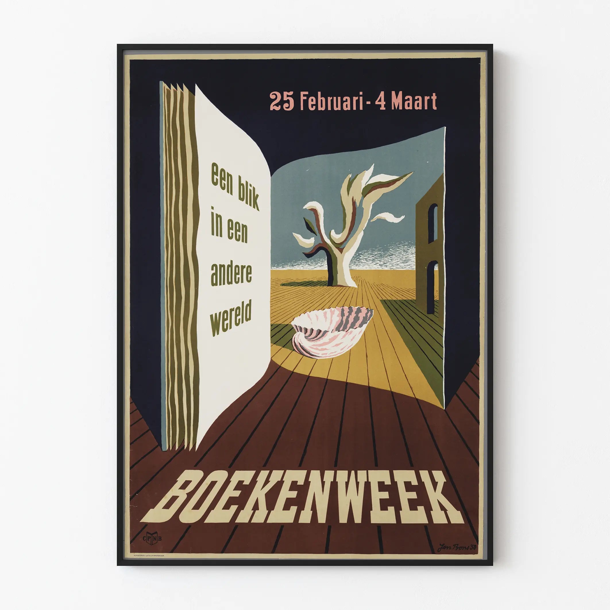 Dieses Vintage-Poster mit dem Titel „Boekenweek“ fängt eine träumerische und surreale Atmosphäre ein, ideal für jede anspruchsvolle Wanddekoration. Präsentiert in dezenten Tönen von Blau, Ocker, Blassrosa und Braun, zeigt es eine große offene Buchseite, die auf eine ungewöhnliche Landschaft blickt, bestehend aus einem stilisierten Baum und einer riesigen Muschel. Dieses Plakat weckt die Vorstellung einer anderen Welt, perfekt im Einklang mit dem Thema des Textes „een blik in een andere wereld“ (ein Blick in eine andere Welt), und erinnert an den literarischen Einfluss und die Magie des Lesens während der Buchwoche, deren Daten oben angegeben sind (25. Februar – 4. März).