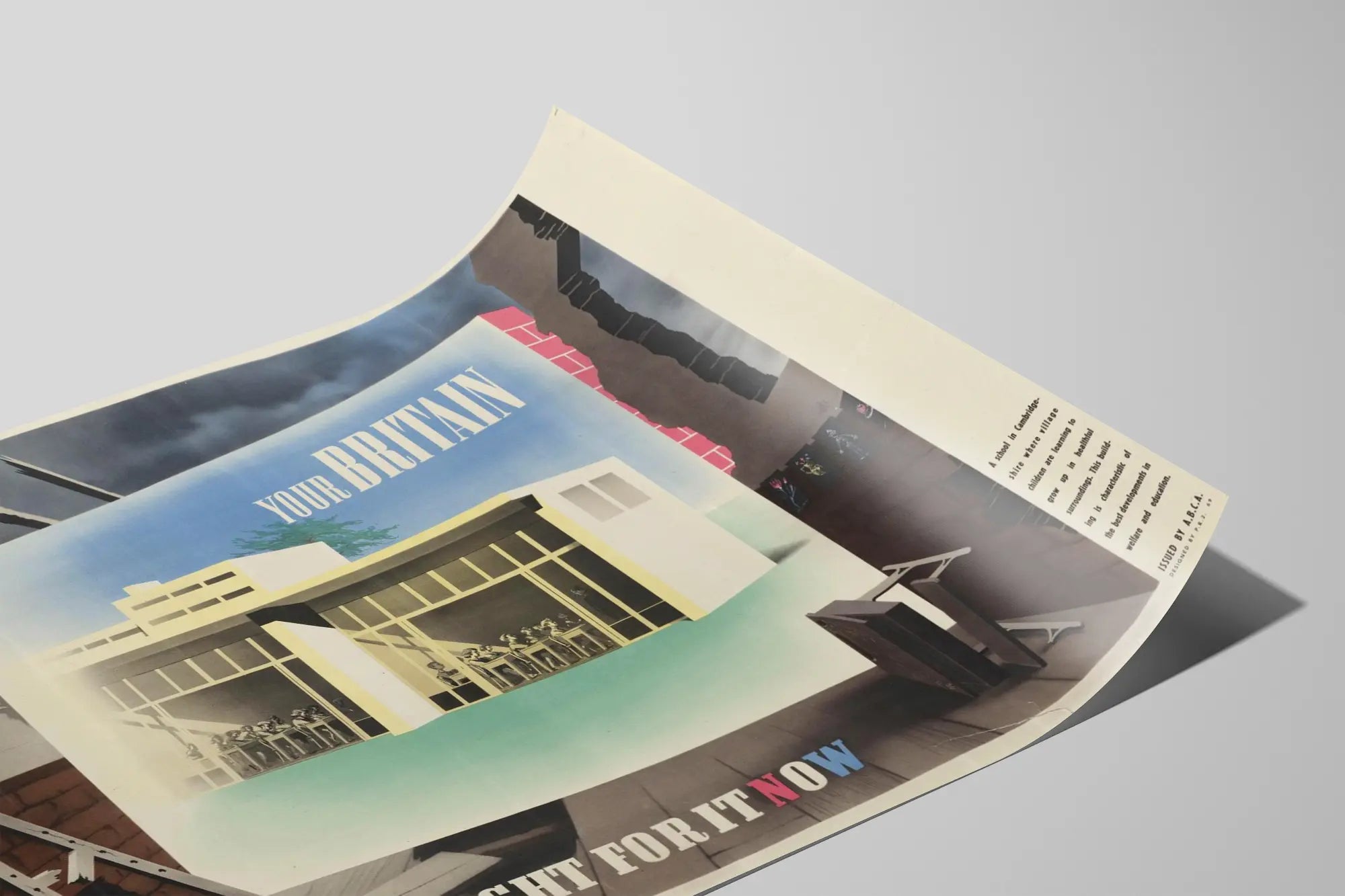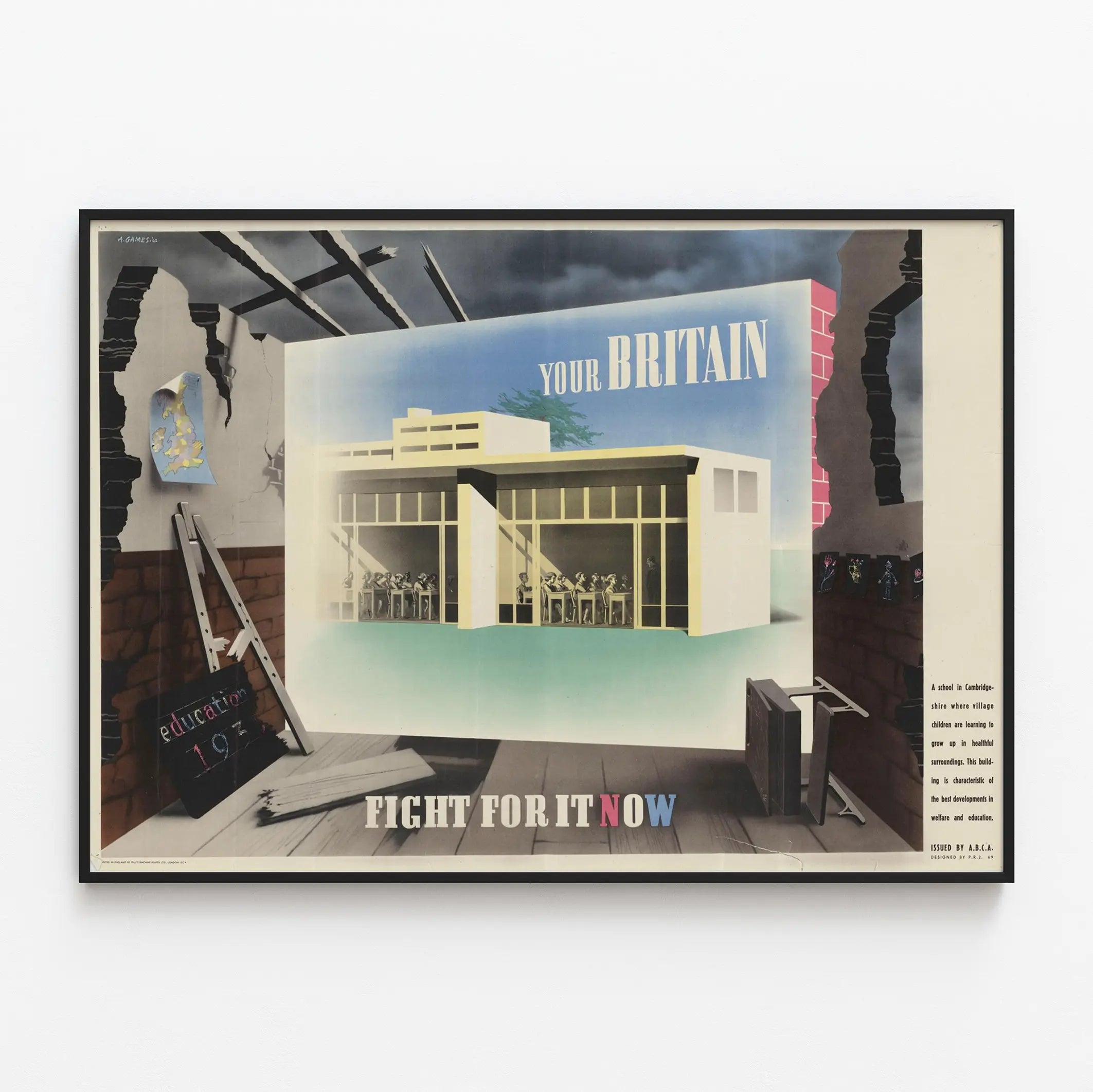 Dieses Vintage-Poster mit dem Titel „Your Britain Fight For It Now“ zeigt eine moderne Schule im Cambridgeshire und vermittelt eine starke Botschaft über Bildung und gesellschaftliche Entwicklung. Es stellt einen hellen und funktionalen Klassenraum dar und hebt die Fortschritte im Bereich Wohlbefinden und Bildung hervor, wobei die Bedeutung hochwertiger Schulgebäude in britischen Dörfern betont wird. Das Plakat stellt die Modernität der Schule gegenüber, in der Kinder in Reihen unter einer klaren kubischen Architektur sitzen, und zeigt im Vordergrund eine verfallene, dunkle Umgebung, die die Herausforderungen und die dringende Notwendigkeit unterstreicht, die Lernbedingungen zu verbessern. Dieses Wandbild ist eine ausgezeichnete Wahl für Geschichtsbegeisterte, Bildungsinteressierte und Vintage-Dekorliebhaber. Seine sanften Farben verbinden Pastelltöne mit tiefen Kontrasten für einen eindrucksvollen visuellen Effekt, der den Blick auf sich zieht. Die Aufschrift „Your Britain“ oben und „Fight For It Now“ unten rufen zu kollektiver Mobilisierung zu einem gesellschaftlich wichtigen Thema auf. Ideal für Wanddekorationen in einem Büro, einem Klassenraum oder einem kulturellen Arbeitsbereich vereint dieses Poster eine engagierte Botschaft mit authentischer Retro-Ästhetik. Es hebt die Bedeutung der Bildung als Grundpfeiler des gesellschaftlichen Wohlbefindens hervor und spiegelt eine Epoche wider, die sich um die Umgestaltung des Schulumfelds bemühte. Wählen Sie dieses Plakat als einzigartiges Dekorelement, das Ihre Wände durch seine historische Aussagekraft und sein markantes Design bereichert und gleichzeitig eine universelle und stets aktuelle Sache betont: den Kampf für eine bessere Zukunft durch Bildung.