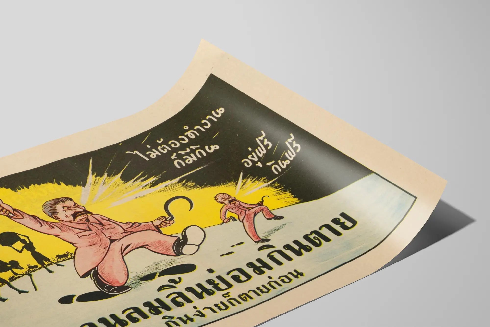 Dieses vintage-illustrationsposter zeigt eine karikaturartige Szene, in der eine Figur im Vordergrund, gekleidet in einem rosa Anzug und schwingend einen Hammer und eine Sichel, dynamisch voranschreitet. Der Hintergrund bildet einen Kontrast zwischen dunklen Tönen und einem leuchtenden Gelb, das die Hauptfigur hervorhebt. Im Hintergrund bücken sich mehrere menschliche Silhouetten unter schweren Lasten in einer natürlichen Landschaft, was einen Kontext von Arbeit oder Ausbeutung andeutet. Dieses Poster passt perfekt zu einer Wanddekoration im Retro- und Engagement-Stil, ideal für Liebhaber grafischer Objekte voller Geschichte und Symbolik. Perfekt, um einem Raum eine originelle Note zu verleihen, begeistert dieses Vintage-Poster aus Bangkok durch seinen erzählerischen Stil und seine eindrucksvolle grafische Ästhetik. Es eignet sich gleichermaßen für Wohnzimmer, Arbeitszimmer oder kreative Räume, die ein Plakat mit kräftigen Farben und ausdrucksstarker Bildsprache suchen. Seine ausgewogene Komposition, die kontrastierende Silhouetten und asiatische Typografie verbindet, bietet eine einzigartige Wanddekoration, die sowohl künstlerisch als auch provokativ ist und gleichzeitig eine kulturell markante Atmosphäre in Ihren Raum bringt. Dieses Vintage-Poster richtet sich an jene, die historische Plakate und sozialkritische Illustrationen schätzen, in einem zeitgenössischen dekorativen Ansatz.