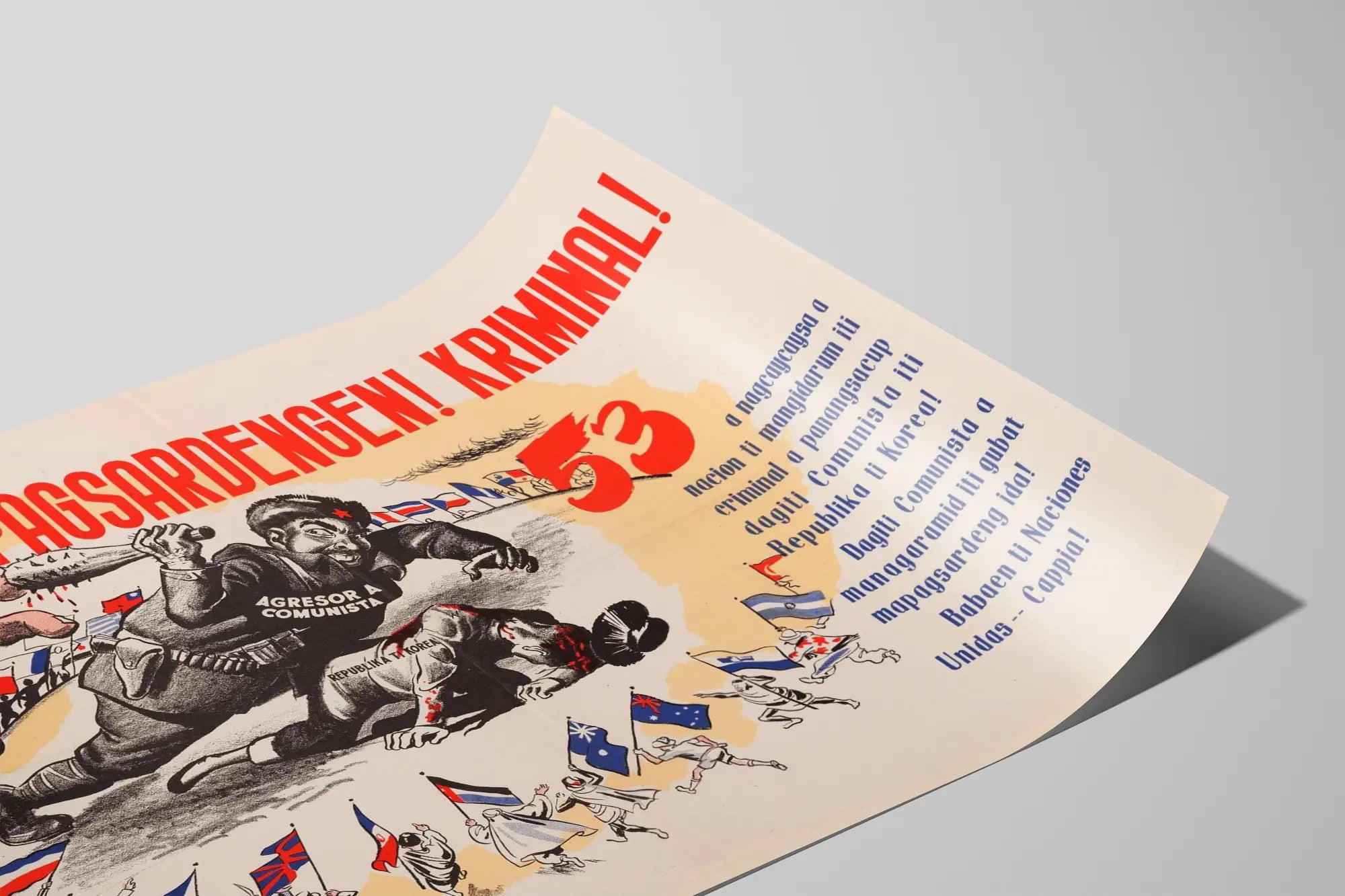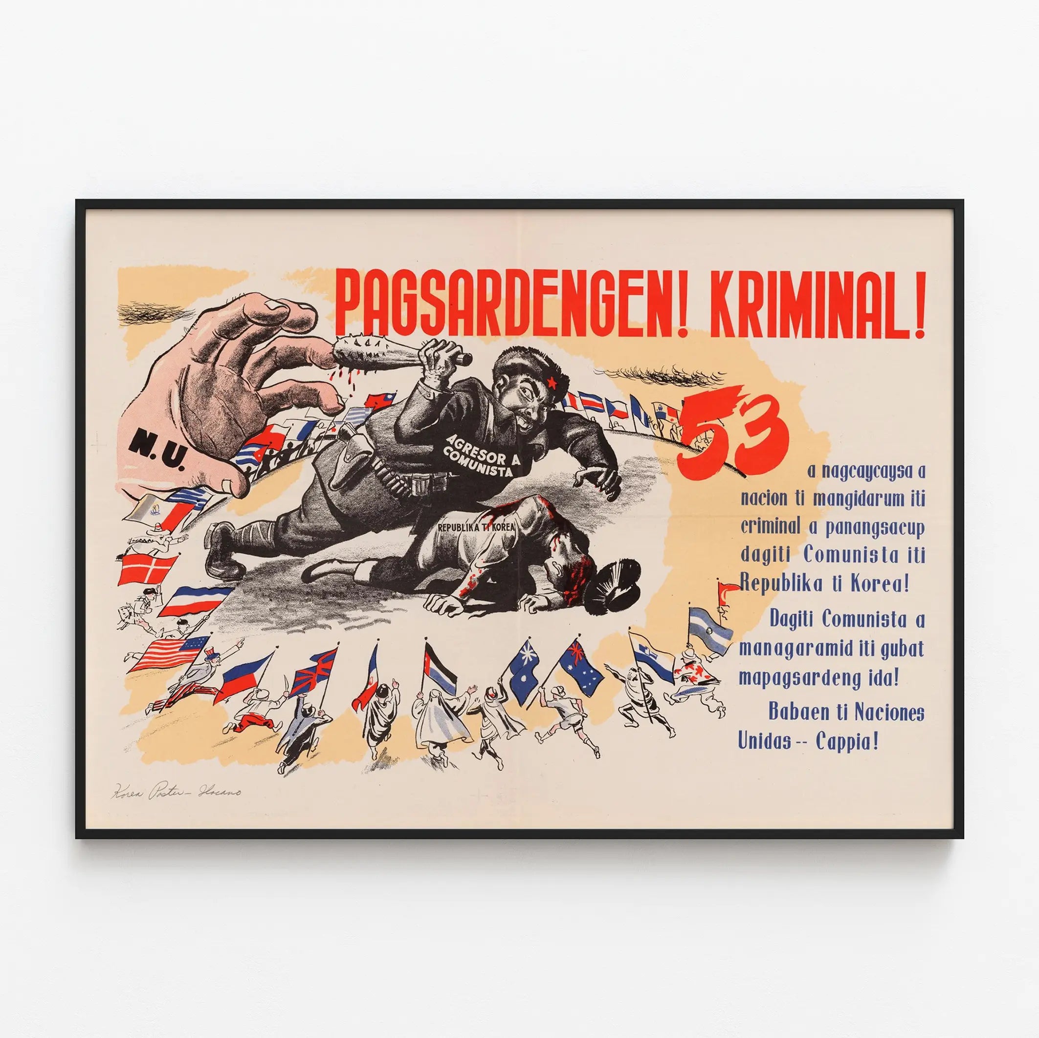 Dieses Vintage-Poster zeigt eine kraftvolle und engagierte Illustration, die in eine Wanddekoration im historischen und politischen Stil eingebunden ist. Es stellt eine dramatische Szene dar, in der eine karikaturhafte Figur in Uniform, als „kommunistischer Angreifer“ identifiziert, eine andere Person am Boden bedroht, die mit „Republika ti Korea“ beschriftet ist. Die Atmosphäre des Posters wird durch die Verwendung der Farben Rot und Schwarz verstärkt, Symbole für Dringlichkeit und Gefahr, kombiniert mit einem hellbeigen Hintergrund, der die Hauptbestandteile intensiv hervorhebt.