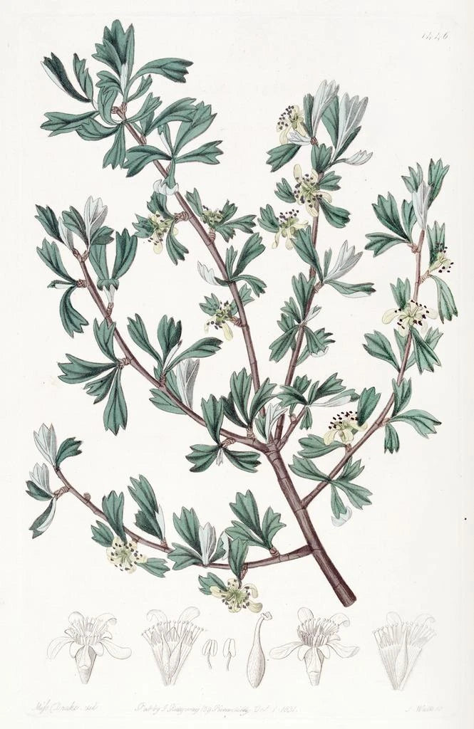Die Purshia mit drei Zähnen, illustriert von Sydenham Edwards, präsentiert sich als Wunder der Natur und verkörpert die Schönheit trockener Landschaften. Ihre zarten Blätter, in zarten Grüntönen, stehen im Kontrast zu den dunkleren Tönen des Bodens und schaffen eine harmonische Komposition. Die von Edwards verwendete Lithographietechnik würdigt die einzigartige Textur dieser Pflanze und fängt gleichzeitig das Licht ein, das auf ihren Oberflächen spielt. Die Atmosphäre, die dieses Werk ausstrahlt, lädt zur Kontemplation ein und offenbart die Kraft und Zerbrechlichkeit der Flora in schwierigen Umgebungen.