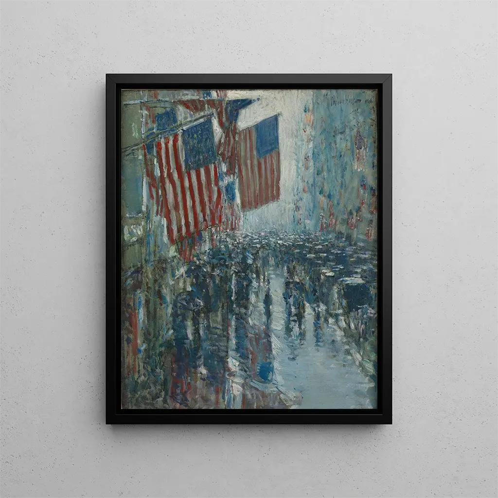 Reproduktion Regen an der Fünften Avenue - Childe Hassam – Faszinierende Einführung Im pulsierenden Universum des impressionistischen Kunsts, hebt sich das Werk "Regen an der Fünften Avenue" von Childe Hassam durch seine Fähigkeit hervor, das Wesen einer pulsierenden Metropole im Bewegung einzufangen. Dieses Gemälde, geschaffen im Jahr 1916, erinnert an eine ikonische Szene aus New York, in der der Regen, weit entfernt von einem bloßen meteorologischen Phänomen, zum Protagonisten einer lebendigen und melancholischen Atmosphäre wird. Die bunten Regenschirme, wie kleine Blumen, die auf dem Asphalt verstreut sind, verwandeln den Grau in eine Palette leuchtender Nuancen und bieten dem Betrachter eine Eintauchen in das urbane Leben. Die Reproduktion dieses Werks ermöglicht es jedem, die Magie dieses flüchtigen Moments zu schätzen und gleichzeitig die Meisterschaft des Künstlers zu würdigen. Stil und Einzigartigkeit des Werks Der Stil von Childe Hassam zeichnet sich durch einen hellen und dynamischen Ansatz aus, bei dem das Licht eine zentrale Rolle in der Komposition spielt. In "Regen an der Fünften Avenue" schaffen schnelle Pinselstriche und nebeneinandergesetzte Farbkleckse ein Gefühl von Bewegung, das fast fühlbar ist. Der Künstler gelingt es, die Energie der Stadt zu vermitteln, während er eine gewisse Sanftheit bewahrt, dank der Verwendung von Pastelltönen, die die Intensität der Szene mildern. Die Reflexionen auf den nassen Pflastersteinen fügen dem Werk eine zusätzliche Dimension hinzu und machen die visuelle Erfahrung noch immersiver. Dieses Gemälde ist eine Ode an die Schönheit des Alltagsmoments, in dem der Regen zum Enthüller urbaner Poesie wird – eine wesentliche Eigenschaft des Impressionismus. Der Künstler und sein Einfluss Childe Hassam, eine ikonische Figur des amerikanischen Impressionismus, hat sich in der Kunstszene des frühen 20. Jahrhunderts etabliert. Geboren 1859 in Dorchester, nahe Boston, wurde er von den großen europäischen Meistern beeinflusst, entwickelte jedoch einen eigenen Stil, der seine Verbundenheit mit der amerikanischen Kultur widerspiegelt. Seine Leidenschaft für Licht und Farbe führte ihn dazu, verschiedene Motive zu erforschen, von Landschaften bis hin zu Szenen des urbanen Lebens. "Regen an der Fünften Avenue" veranschaulicht perfekt sein Talent, den Geist einer Epoche und eines