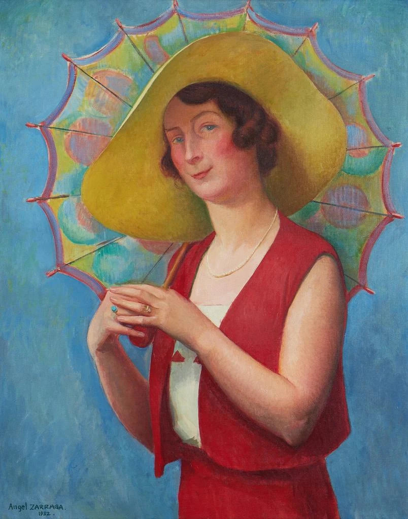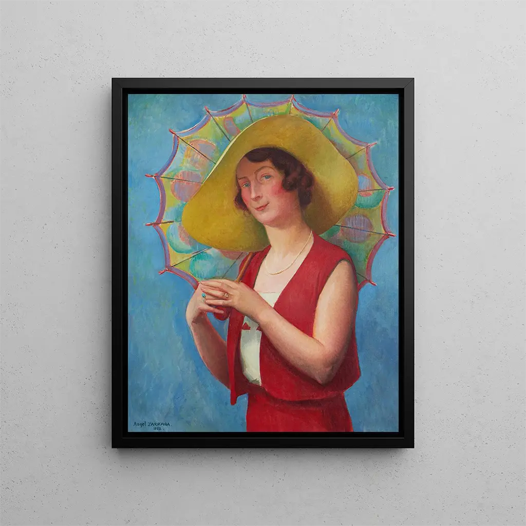 Die Palette von Zárraga, geprägt von warmen, matten Tönen, verleiht dem Gemälde eine Atmosphäre, die sowohl intim als auch raffiniert ist. Der Sonnenschirm, ein wiederkehrendes Motiv in der modernen Malerei, wird hier zum Symbol für Scham und Geheimnis und verstärkt die emotionale Tiefe des Porträts.