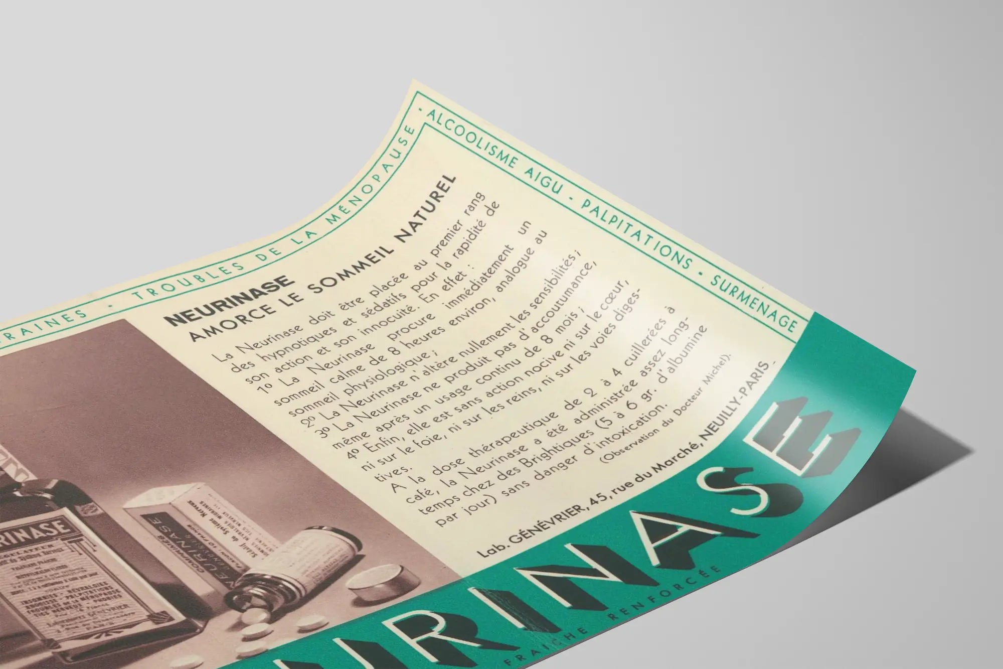 Dieses Vintage-Poster Neurinase ist ein ideales Wanddekorationselement für Liebhaber des Retro-Stils und der pharmazeutischen Authentizität. Es zeigt ein altes französisches Arzneimittelprodukt, wobei die Abbildung die Flasche Neurinase umgeben von ihrer Originalverpackung präsentiert und eine Epoche widerspiegelt, in der Werbung auf schlichtes Design und detaillierten Beschreibungstext setzte. Der grafische Stil, typisch für die Mitte des 20. Jahrhunderts, verleiht jedem Raum durch seine harmonischen Sepia- und Grüntöne eine Note traditioneller Eleganz. Diese Wanddekoration erinnert an die Versprechen des Produkts: einen natürlichen, ruhigen und beruhigenden Schlaf, mit schneller Wirkung und ohne schädliche Nebenwirkungen. Der Text, der einen alten typografischen Stil bewahrt, hebt die angeblichen Vorzüge von Neurinase hervor, insbesondere ihre Unbedenklichkeit, Nicht-Überempfindlichkeit und das Fehlen von Abhängigkeit, Eigenschaften, die damals mit medizinischen Argumenten betont wurden. Um das zentrale Bild herum beschreibt eine Randlinie die Beschwerden, die das Produkt gezielt behandelt, wie Schlaflosigkeit, Hysterie, Migräne, Menopause, akuten Alkoholismus und Überarbeitung. Dieses Poster kann eine originelle Dekorationswahl für eine Arztpraxis, eine rekonstruierte alte Apotheke oder einfach, um einem Wohnzimmer, einer Bibliothek oder einem Büro einen Vintage- und historischen Akzent zu verleihen, sein. Das Plakat lädt zu einer Zeitreise ein und hebt eine minimalistische, informative „Old School“-Ästhetik hervor. Es eignet sich sowohl für Sammler alter Werbeplakate als auch für Liebhaber von Wanddekorationen mit nostalgischem Charme. Das Werk, durch seine klare und gut lesbare Präsentation, lässt sich leicht in eine Vintage- oder Industrieatmosphäre integrieren. Die grafische Qualität und die ausgewogene Komposition machen es zu einer idealen Wanddekoration, um eine Wand mit einem Hauch von Authentizität und pharmazeutischer Nostalgie zu bereichern – ein Zeugnis französischer Handwerkskunst.