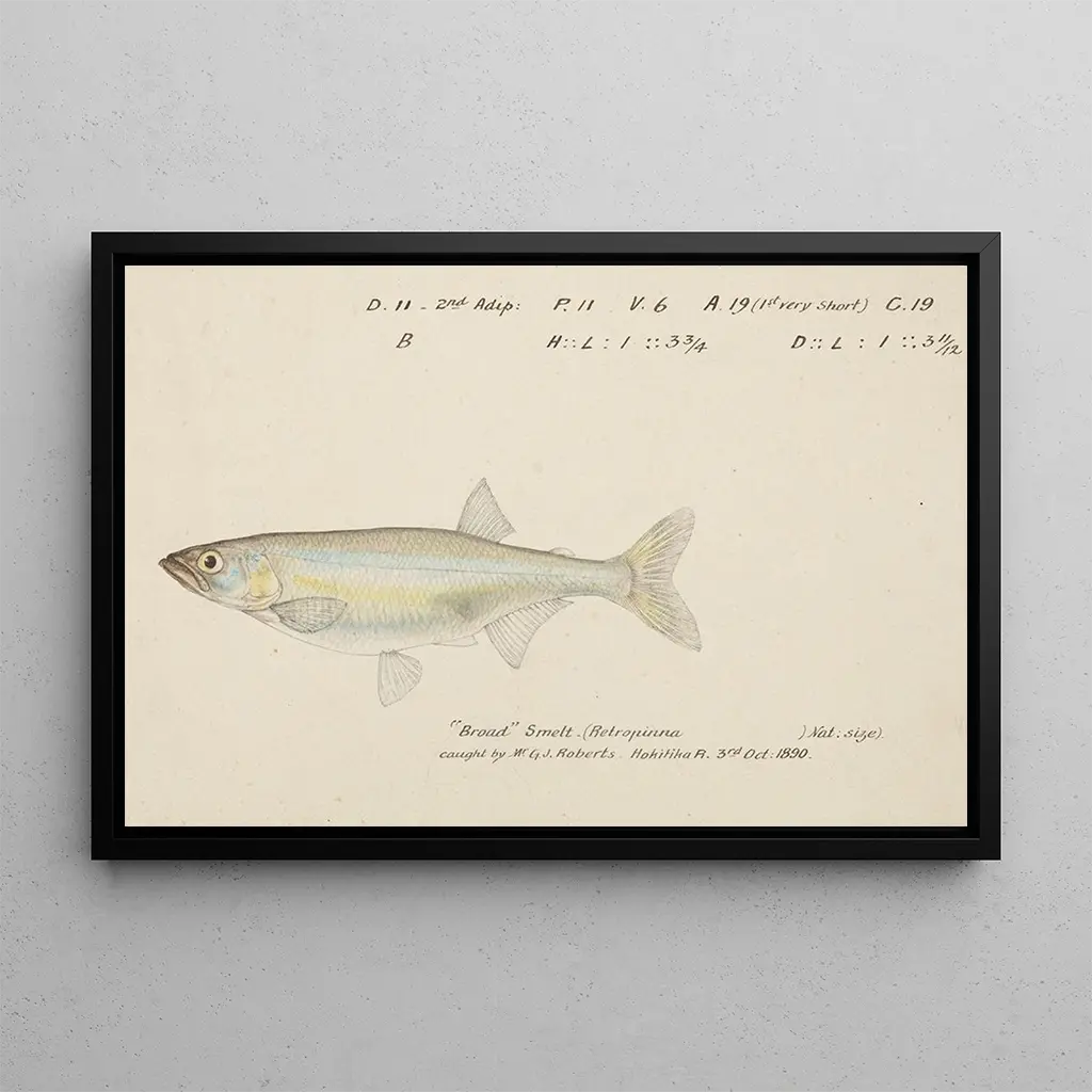 Die Reproduktion von Retropinna retropinna, der L-Äperlan, ist eine wertvolle Ergänzung Ihrer Innendekoration. Ob im Büro, Wohnzimmer oder Schlafzimmer – dieses Kunstwerk verleiht jedem Raum eine Note von Eleganz und Ruhe. Die Druckqualität sorgt für eine bemerkenswerte Farbtreue und Detailgenauigkeit des Originalwerks und schafft einen faszinierenden Blickfang in jedem Raum. Mit dieser Leinwand bieten Sie nicht nur ein Kunstwerk für Ihr Zuhause, sondern auch eine Einladung, die Schönheit der Meereswelt zu entdecken, und bereichern Ihre Umgebung auf ästhetische und inspirierende Weise.