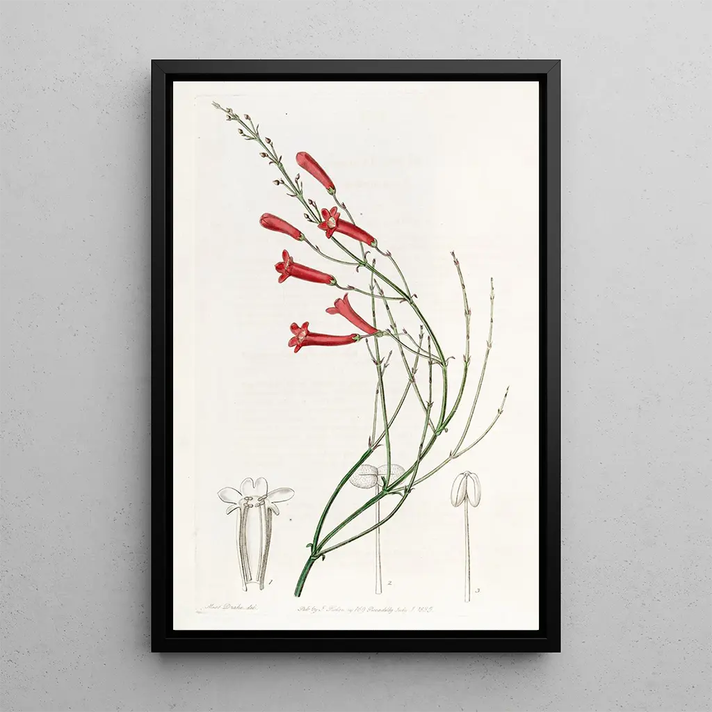 Russelia jonciforme : ein Tanz aus Formen und Farben Die reproduction der Russelia jonciforme, ein Werk von Sydenham Edwards, entführt uns in einen üppigen Garten, in dem die Farben anmutig miteinander verschmelzen. Dieses Gemälde, geprägt durch seine schlanken Stängel und glockenförmigen Blüten, evoziert eine zarte, fast tanzende Bewegung. Die Nuancen von Grün und Rot ergänzen sich harmonisch und schaffen eine lebendige, fröhliche Atmosphäre. Die Detailgenauigkeit, typisch für die botanische Illustration, hebt die einzigartige Schönheit dieser Pflanze hervor und lädt den Betrachter ein, jedes Element ihrer Struktur zu erkunden. Sydenham Edwards : Kunst im Dienste der Wissenschaft Sydenham Edwards, botanischer Illustrator des frühen 19. Jahrhunderts, spielte eine entscheidende Rolle bei der Dokumentation pflanzlicher Arten. Seine Arbeit, beeinflusst von den wissenschaftlichen Fortschritten seiner Zeit, vereinte Kunst und Wissenschaft auf innovative Weise. Als Mitglied der Royal Society trug er zu Referenzwerken bei, darunter "The Botanical Register", in dem seine Illustrationen, wie die der Russelia jonciforme, zu Mustern für Präzision und Schönheit wurden. Edwards hinterließ so ein nachhaltiges Erbe, das Leidenschaft für die Natur mit künstlerischem Talent verbindet. Eine dekorative Anschaffung mit vielfältigem Nutzen Die reproduction der Russelia jonciforme ist ein ideales dekoratives Stück, um Ihr Interieur zu bereichern, sei es im Wohnzimmer, im Büro oder im Schlafzimmer. Ihre Druckqualität und die Treue zu den Originalfarben machen sie zu einer attraktiven Wahl für Botaniker und Kunstliebhaber. Durch die Integration dieses Gemäldes in Ihre Dekoration bringen Sie einen Hauch Natur und Vitalität in Ihren Raum. Die ästhetische Anziehungskraft dieses Werks, mit seinen eleganten Formen und leuchtenden Farben, macht es zu einem zentralen Element, das den Blick auf sich zieht und Bewunderung hervorruft.