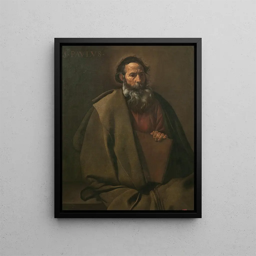 Der Stil von Velázquez ist bemerkenswert durch seine Fähigkeit, die Essenz seiner Motive einzufangen. In "Saint Paul" wird die Technik des Hell-Dunkel-Kontrasts hervorgehoben, wodurch der Kontrast zwischen göttlichem Licht und der Dunkelheit, die den Heiligen umgibt, verstärkt wird. Die minutösen Details, wie die Falten des Gewands und der Gesichtsausdruck, zeugen von einer gründlichen Beobachtung und Respekt vor der Menschlichkeit seiner Figuren. Die Komposition, zugleich einfach und kraftvoll, lenkt die Aufmerksamkeit auf Saint Paul, während sie eine spirituelle Dimension durchscheinen lässt. Dieses Werk beschränkt sich nicht auf eine figurative Darstellung; es evoziert auch universelle Themen wie Glauben, Erlösung und die Suche nach Wahrheit, was "Saint Paul" zu einem zeitlosen Stück macht, das mit menschlichen Anliegen resoniert.