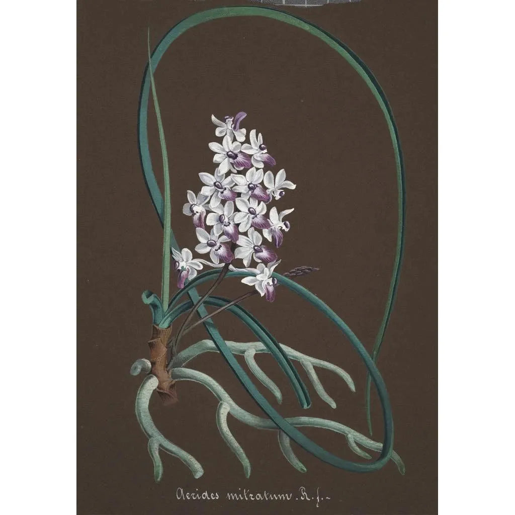 Der anonyme Künstler dieses Werks ist Teil einer künstlerischen Tradition, die die Natur und die Botanik würdigt. Orchideen, oft mit Schönheit und Liebe assoziiert, waren ein bevorzugtes Thema in der Blumenmalerei durch die Jahrhunderte. Diese Epoche, geprägt von wachsendem Interesse an der Natur, sah Künstler, die die Formen und Farben der Pflanzen mit bemerkenswerter Präzision erforschten. Kulturelle Einflüsse, insbesondere die asiatischer Künste, sind sichtbar in der Art und Weise, wie die Blumen inszeniert werden, was einen Dialog zwischen Kunst und Wissenschaft bezeugt.