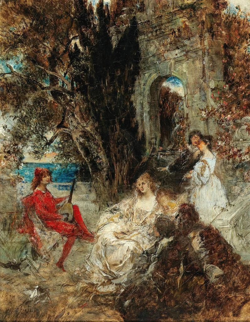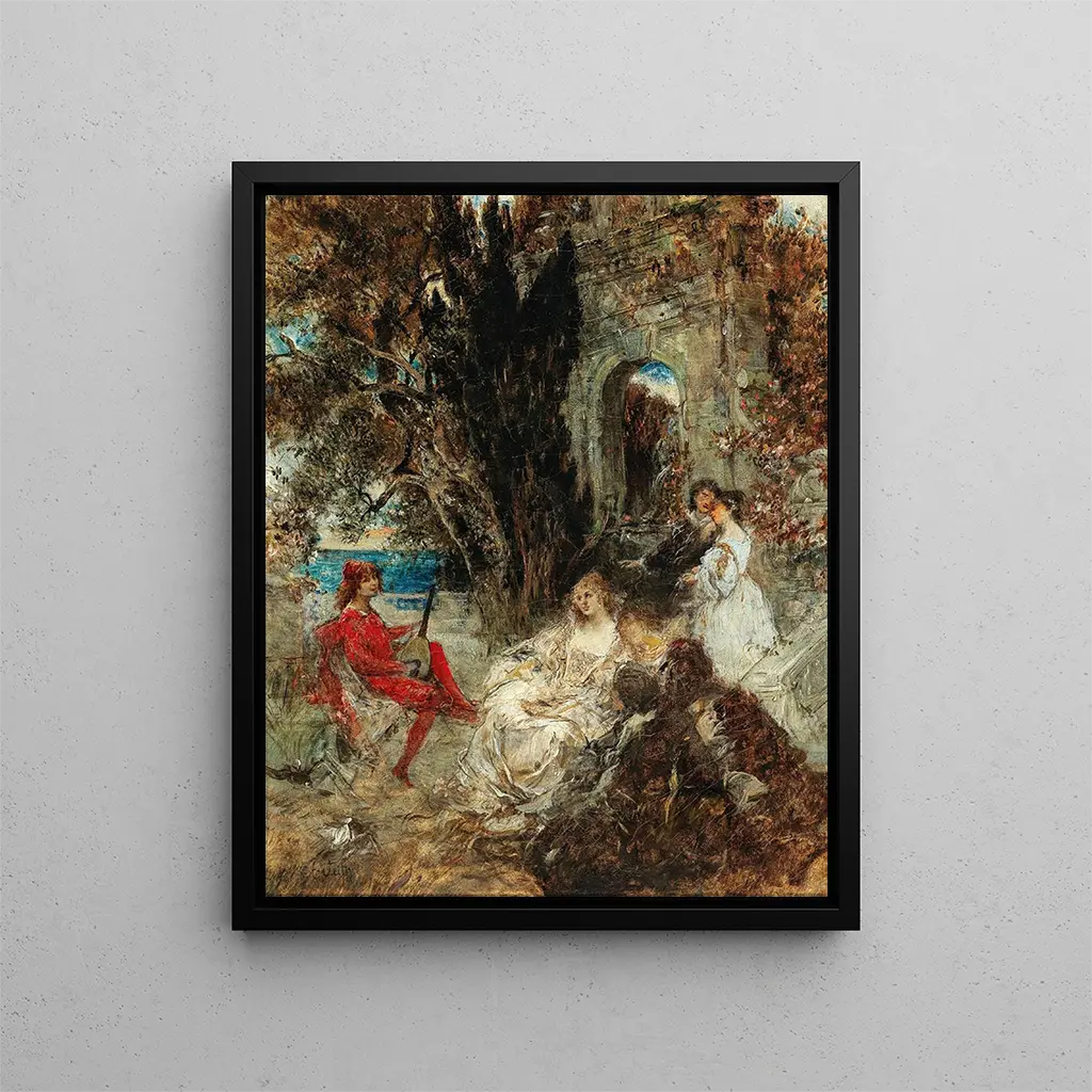 Reproduktion Sérénade - Eduard Veith – Einführung fesselnd In dem weiten Panorama der Kunstgeschichte heben sich bestimmte Werke durch ihre Fähigkeit hervor, Momente von Schönheit und Emotion einzufangen. "Sérénade - Eduard Veith" ist eines dieser Werke, das uns in eine Welt entführt, in der die Melodie der Farben und Formen sich miteinander verweben, um eine Atmosphäre zu schaffen, die zugleich sanft und bezaubernd ist. Dieses Werk, geprägt von Romantik, erinnert an eine intime Szene, in der die Musik aus den Leinwänden zu steigen scheint, um den Betrachter zu umhüllen. Beim Betrachten dieses Kunstdrucks spürt man fast das Echo der Noten einer Sérénade, eine Einladung zum Träumen und Nachdenken. Stil und Einzigartigkeit des Werks Der Stil von "Sérénade" zeichnet sich durch eine zarte Harmonie zwischen Licht und Schatten aus, die ein Spiel von Kontrasten schafft, das sofort ins Auge fällt. Eduard Veith, Meister der romantischen Malerei, verwendet warme Farben und subtile Nuancen, um seinen Figuren Leben einzuhauchen. In diesem Werk sind die menschlichen Figuren so fein dargestellt, dass sie fast greifbar erscheinen, als könnte man ihren Atem hören. Die Komposition, sorgfältig inszeniert, führt das Auge durch die Szene und ermöglicht eine vollständige Eintauchen in diesen im Moment schwebenden Augenblick. Die Leichtigkeit der Posen und die Flüssigkeit der Bewegungen der Figuren zeugen von einem außergewöhnlichen Können, das dieses Werk einzigartig macht. Der Künstler und sein Einfluss Eduard Veith, Künstler deutscher Herkunft, hat sich im Kunstbetrieb des 19. Jahrhunderts durch einen unverwechselbaren Stil durchgesetzt, der Romantik und Realismus verbindet. Beeinflusst von den großen Meistern seiner Zeit, entwickelt er einen persönlichen Ansatz, der den Ausdruck menschlicher Emotionen in den Mittelpunkt stellt. Veith hat die Essenz seiner Motive eingefangen und sie in wahre Verkörperungen der Empfindsamkeit verwandelt. Seine Werke, oft inspiriert von Musik und Poesie, zeugen von einem tiefen Verständnis der menschlichen Seele. Der Einfluss seiner Arbeit reicht über seine Epoche hinaus und inspiriert zahlreiche zeitgenössische und zukünftige Künstler, die die Beziehung zwischen Kunst und Emotion erforschen möchten. Eine außergewöhnliche Wanddekoration signiert Artem Legrand Im Bereich der Inneneinrichtung ist der Kunstdruck von "Sérénade"