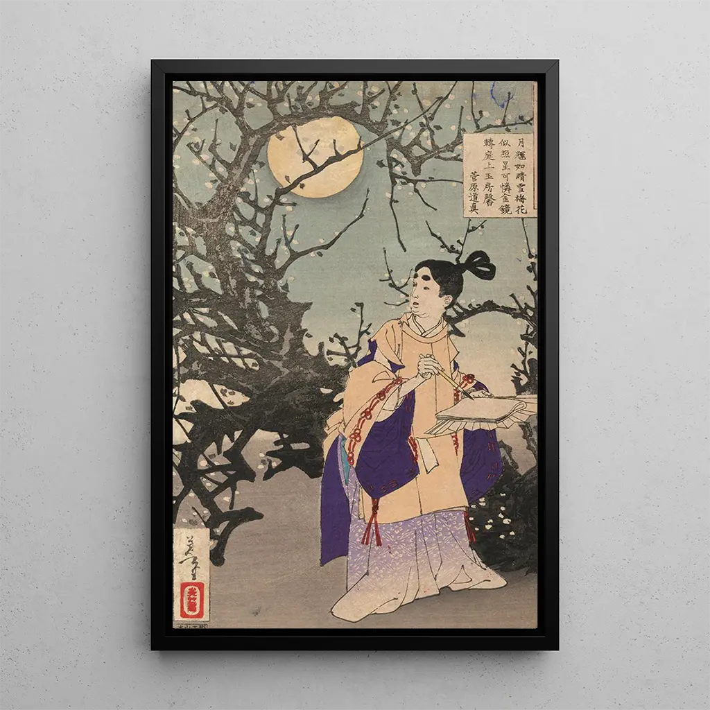 Sugawara no Michizane : eine Hommage an Weisheit und Melancholie In diesem ikonischen Werk präsentiert Tsukioka Yoshitoshi Sugawara no Michizane, eine verehrte historische Figur in Japan. Das Gemälde zeigt die Figur in nachdenklicher Haltung, umgeben von Symbolen der Weisheit wie den Gänsefedern. Die sanften Farben und zarten Nuancen schaffen eine ruhige, fast kontemplative Atmosphäre. Die Ukiyo-e-Technik ermöglicht es, die Tiefe der Emotionen einzufangen, was diesen Kunstdruck des Gemäldes Sugawara no Michizane sowohl berührend als auch inspirierend macht und den Betrachter einlädt, in die Geschichte dieser legendären Persönlichkeit einzutauchen. Tsukioka Yoshitoshi : ein Meister des japanischen Drucks Tsukioka Yoshitoshi, geboren 1839, gilt als einer der letzten großen Meister des Ukiyo-e, eines japanischen Druckstils, der zwischen dem 17. und 19. Jahrhundert seine Blütezeit erlebte. Seine Karriere war geprägt von vielfältigen Einflüssen, die von alten Traditionen bis zu den soziopolitischen Veränderungen der Meiji-Ära reichten. Yoshitoshi verstand es, Elemente der Popkultur zu integrieren und gleichzeitig die Reichtum klassischer Themen zu bewahren. Seine Werke, oft voller Emotionen und Symbolik, zeugen von seinem einzigartigen Talent und seiner Bedeutung in der Geschichte der japanischen Kunst, wie diese Reproduktion des Gemäldes Sugawara no Michizane zeigt. Eine dekorative Anschaffung mit vielfältigen Vorzügen Der Kunstdruck des Gemäldes Sugawara no Michizane ist ein dekoratives Stück, das Ihrem Interieur eine Note von Authentizität und Kultur verleiht. Ob im Wohnzimmer, im Büro oder im Schlafzimmer, er wird die Aufmerksamkeit auf sich ziehen und Ihre Dekoration bereichern. Die Qualität des Drucks und die Treue zu den Details des Originalwerks garantieren eine raffinierte Ästhetik. Mit diesem Leinwandbild investieren Sie in ein Werk, das nicht nur Ihren Raum verschönert, sondern auch eine tiefgründige Geschichte evoziert, sodass jeder Blick eine Reise durch die Zeit und die japanische Kultur wird.