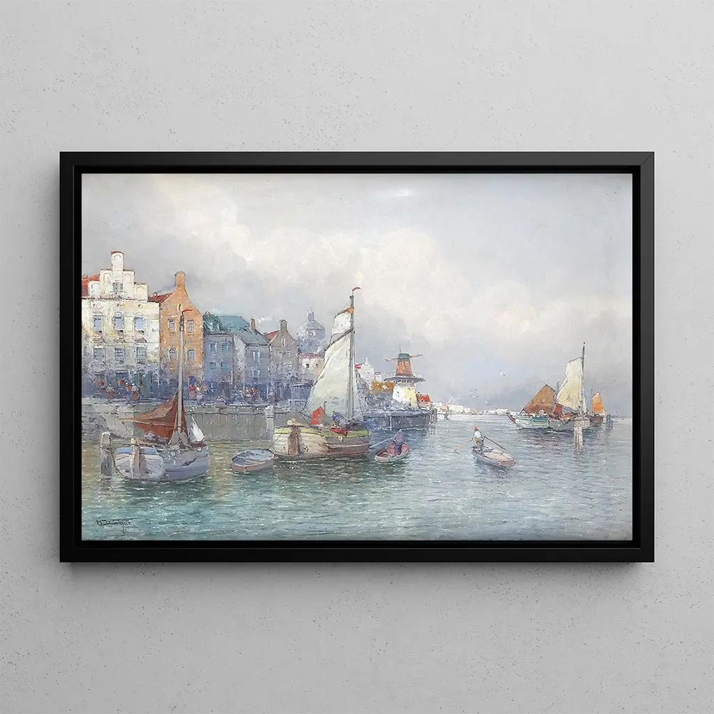 Szenen eines holländischen Hafens: ein Tanz aus Licht und Leben Die kunstdruck der Szenen eines holländischen Hafens entführt uns in ein lebendiges Gemälde, in dem die Nuancen von Blau und Grün harmonisch verschmelzen. Die weißen Segel der Boote heben sich auf dem schimmernden Wasser ab, während die Figuren, gekleidet in historische Kostüme, am Kai beschäftigt sind. Die Technik von Georg Fischhof, der zarte Pinselstriche verwendet, schafft eine lebendige und dynamische Atmosphäre, die fast greifbar ist. Dieses Gemälde evoziert nicht nur einen eingefrorenen Moment in der Zeit, sondern auch die Lebendigkeit eines geschäftigen Hafens, der den Betrachter einlädt, die Geschichten hinter jedem Gesicht zu erahnen. Georg Fischhof: ein Meister des maritimen Realismus Georg Fischhof, österreichischer Maler des 19. Jahrhunderts, ist bekannt für seine maritimen kunstdrucke, die das Wesen des Hafenlebens einfangen. Beeinflusst vom realistischen Stil, konnte er die Details des Alltags präzise wiedergeben und gleichzeitig eine poetische Dimension in seine Kompositionen einfließen lassen. Fischhof hat häufig die Themen Meer und Häfen erforscht, was die Bedeutung dieser Orte im Handel und in der Kultur seiner Zeit unterstreicht. Sein Stil, geprägt von einer sorgfältigen Detailarbeit und einer reichen Farbpalette, macht ihn zu einem unverzichtbaren Künstler für Liebhaber maritimer kunst. Eine dekorative Anschaffung mit vielfältigen Vorzügen Die kunstdruck der Szenen eines holländischen Hafens zu wählen, bedeutet, eine Leinwand zu erwerben, die Ihrem Interieur eine elegante Note verleiht. Ob im Wohnzimmer, im Büro oder im Schlafzimmer, dieses Werk wird die Blicke auf sich ziehen und Gespräche anregen. Die Druckqualität garantiert eine Farbtreue und Detailgenauigkeit des Originals, verbunden mit einer unverkennbaren ästhetischen Anziehungskraft. Durch die Integration dieses kunstdrucks in Ihre Dekoration fügen Sie nicht nur ein Kunstwerk hinzu, sondern auch ein Fenster zu einer maritimen Welt voller Geschichte und Leben.
