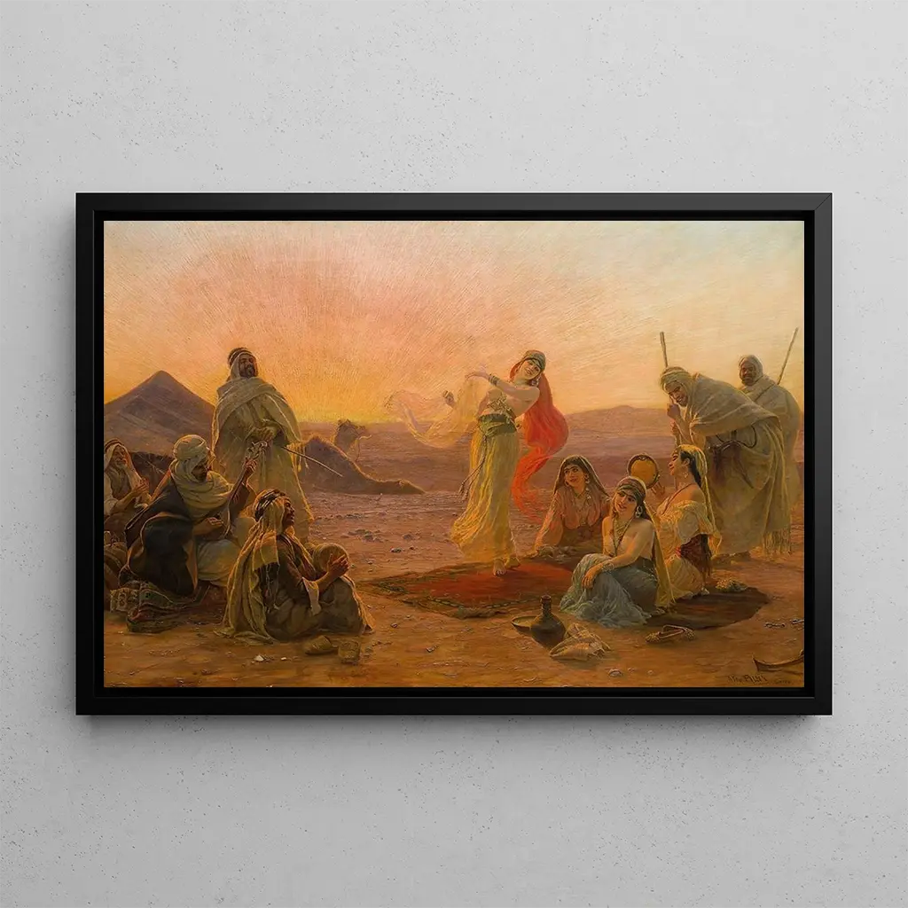 Danse au Coucher du Soleil : ein Kunstdruck eines Farb- und Lichterballetts „Danse au Coucher du Soleil“ ist ein lebendiges Kunstwerk, das die Essenz eines flüchtigen Moments einfängt, in dem das goldene Licht der untergehenden Sonne die Tänzer in eine warme und festliche Atmosphäre hüllt. Die leuchtenden Farben, die von tiefem Orange bis zu zarten Violett reichen, schaffen einen beeindruckenden Kontrast, der sofort ins Auge fällt. Die Öl-auf-Leinwand-Technik ermöglicht es Otto Pilny, mit Schatten und Licht zu spielen und den anmutigen Bewegungen der tanzenden Figuren Leben einzuhauchen. Diese Szene ruft Lebensfreude und eine Feier der Schönheit des gegenwärtigen Moments hervor. Otto Pilny : der Künstler des Exotismus und der Flucht Otto Pilny, Maler des frühen 20. Jahrhunderts, ist bekannt für seine Darstellungen orientalischer und exotischer Szenen. Beeinflusst von seinen Reisen im Orient, verstand es Pilny, verschiedene kulturelle Elemente in seine Werke zu integrieren und so einen einzigartigen Stil zu schaffen, der Realismus und Fantasie verbindet. Seine Arbeiten zeichnen sich durch eine besondere Liebe zum Detail und eine Palette leuchtender Farben aus, die charakteristisch für seinen künstlerischen Ansatz sind. Durch seine Gemälde lädt Pilny den Betrachter ein, in ferne Länder zu entfliehen und gleichzeitig die Schönheit von Traditionen und Tänzen zu feiern. Eine dekorative Reproduktion mit vielfältigen Vorzügen Der Kunstdruck von „Danse au Coucher du Soleil“ ist ein Meisterwerk, das Ihre Inneneinrichtung bereichern wird. Ob im Wohnzimmer, Büro oder Schlafzimmer, diese Leinwand verleiht Ihrem Raum eine dynamische und warme Note. Die Reproduktionsqualität garantiert eine Treue zu den Nuancen und Details des Originalwerks, sodass die Energie der Szene voll zur Geltung kommt. Mit ihrer unbestreitbaren ästhetischen Anziehungskraft fügt sich dieses Kunstwerk perfekt in verschiedene Einrichtungsstile ein und schafft eine einladende und inspirierende Atmosphäre.