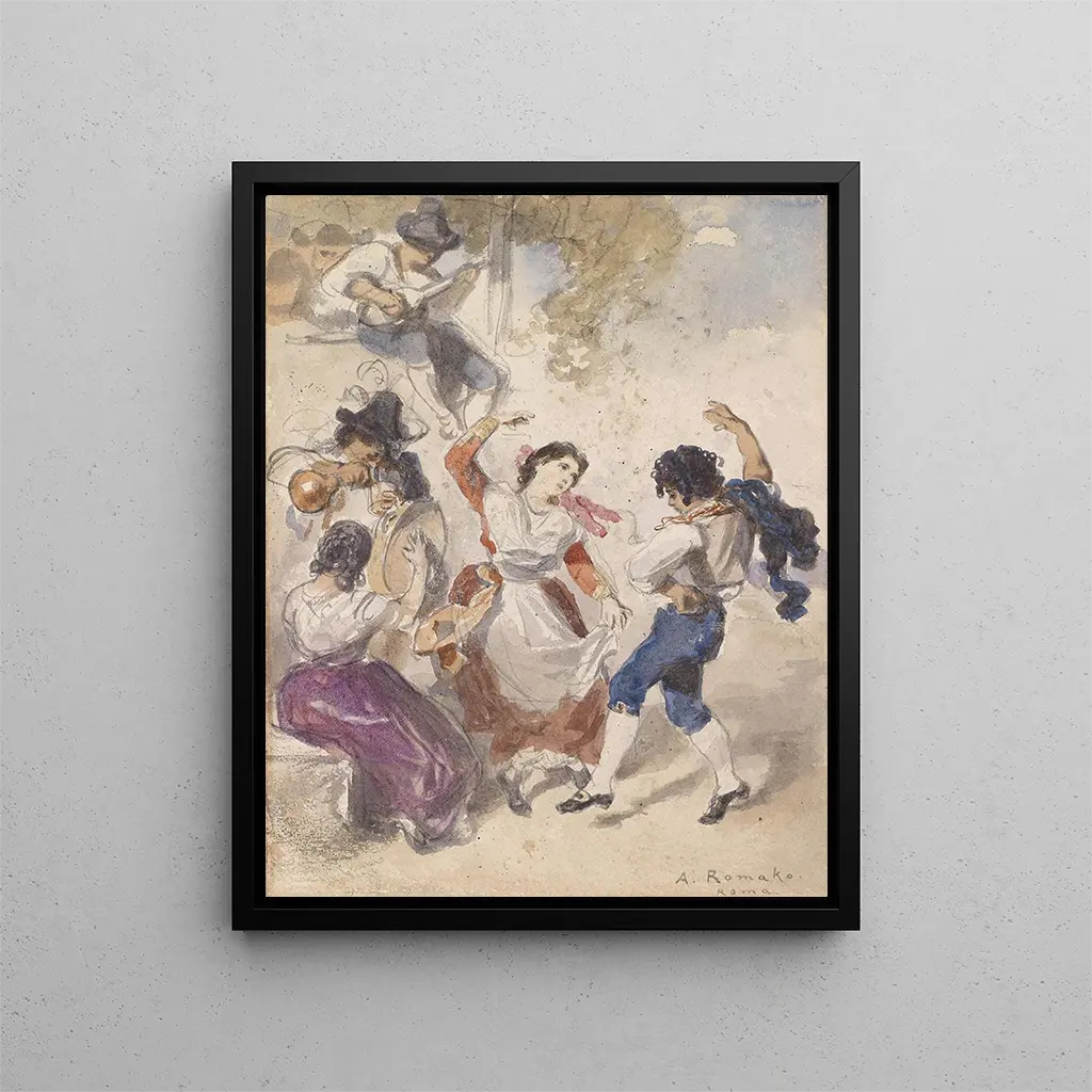 Reproduktion Tarentelle - Anton Romako – Einführung fesselnd Das Gemälde "Tarentelle" von Anton Romako ist ein Werk, das mit Bravour den Geist und die Lebendigkeit der italienischen Kultur evoziert. Durch dieses ikonische Stück gelingt es dem Künstler, einen Moment der Jubel und Bewegung einzufangen, in dem Tanz und Musik in einem faszinierenden visuellen Spektakel verschmelzen. Das Werk entführt uns in ein pulsierendes Universum, in dem die Leidenschaft und Energie der Tarentelle, eines volkstümlichen Tanzes Süditaliens, auf der Leinwand lebendig werden. Das sorgfältig gewählte Licht und die Farben scheinen ebenfalls zu tanzen und schaffen eine bezaubernde Atmosphäre, die den Betrachter einlädt, in dieses Gemälde einzutauchen. Stil und Einzigartigkeit des Werks Der Stil von Anton Romako ist geprägt von einer impressionistischen Herangehensweise, bei der Licht und Farbe eine zentrale Rolle spielen. In "Tarentelle" zeugen die dynamischen Pinselstriche und die leuchtenden Töne von dem Wunsch, den Moment einzufangen und die Energie des Tanzes greifbar zu machen. Die Figuren, gekleidet in traditionelle Kostüme, sind in lebendigen Posen dargestellt, ihre fließenden Bewegungen deuten auf eine im Aufschwung befindliche Choreografie hin. Die Komposition ist sorgfältig orchestriert, jedes Element trägt zur allgemeinen Harmonie des Werks bei. Die Details, obwohl vorhanden, belasten die Szene niemals, sondern bereichern vielmehr die visuelle Erfahrung und bieten dem Betrachter eine Vielzahl von interessanten Punkten zum Erkunden. Der Künstler und sein Einfluss Anton Romako, ein österreichischer Maler, hat sich im europäischen Kunstbetrieb des 19. Jahrhunderts durch sein außergewöhnliches Talent und seine Fähigkeit, das Wesen seiner Motive einzufangen, durchgesetzt. Beeinflusst von den künstlerischen Bewegungen seiner Zeit, verband er Tradition und Moderne und integrierte Elemente der Volkskultur in seine Werke. Seine Faszination für das tägliche Leben und die volkstümlichen Traditionen zeigt sich besonders in "Tarentelle", wo er der kulturellen Vielfalt Italiens Tribut zollt. Romako trug dazu bei, die Volkskunst neu zu entdecken und aufzuwerten, und inspirierte zahlreiche Künstler, ähnliche Themen zu erforschen. Sein Erbe besteht fort, und seine Arbeiten sind weiterhin eine Inspirationsquelle für diejenigen, die die Schönheit feiern möchten.