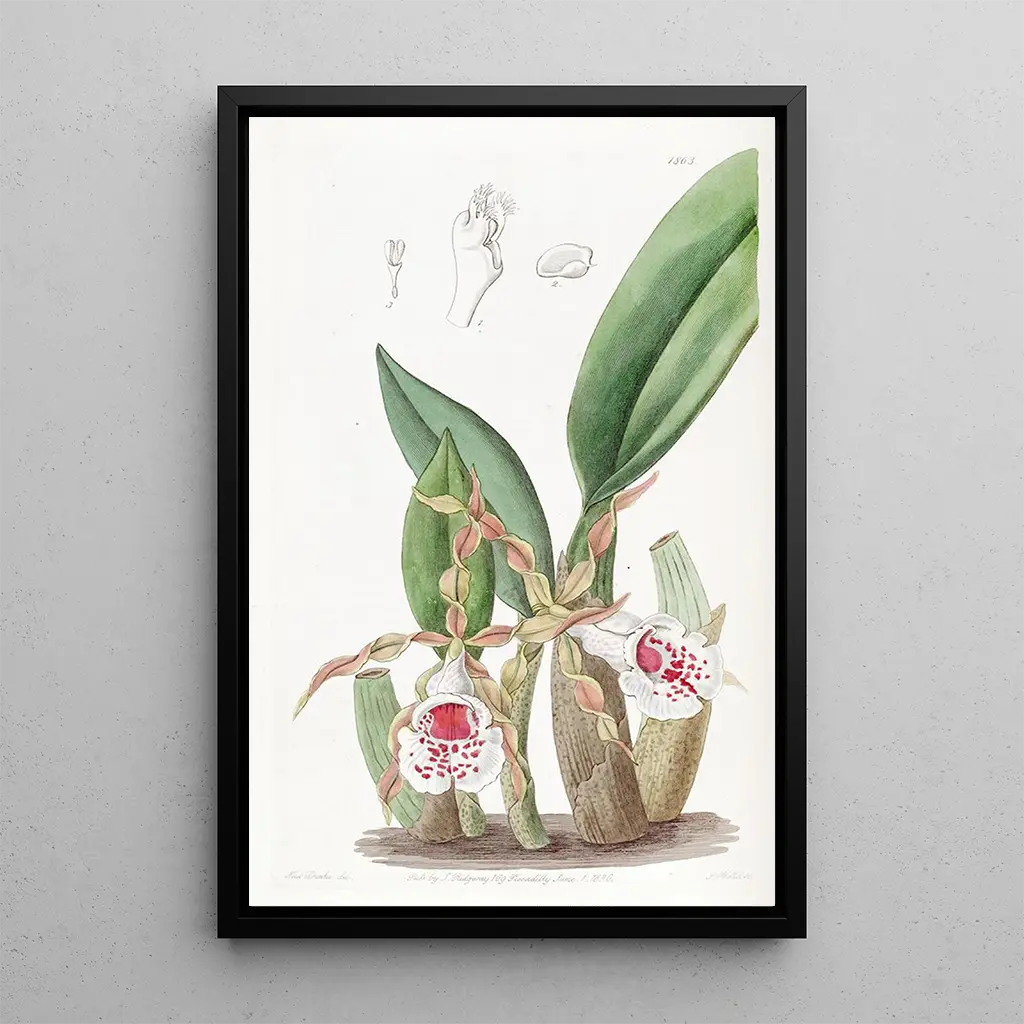 Die kunstdruck der Trichopilia mit gedrehten Blütenblättern evoziert eine unvergleichliche Zartheit, bei der jedes Blütenblatt zu einer hypnotischen Tanzbewegung zu verschmelzen scheint. Die Nuancen von Violett und Weiß verschmelzen harmonisch und schaffen ein lebendiges Bild, das das Licht auf faszinierende Weise einfängt. Die Aquarelltechnik, die von Sydenham Edwards verwendet wird, verleiht diesem Werk eine luftige Leichtigkeit, fast ätherisch. Die Atmosphäre, die von diesem Gemälde ausgeht, lädt zur Kontemplation ein und entführt den Betrachter in einen üppigen Garten, in dem die Natur in ihrer ganzen Pracht erstrahlt.