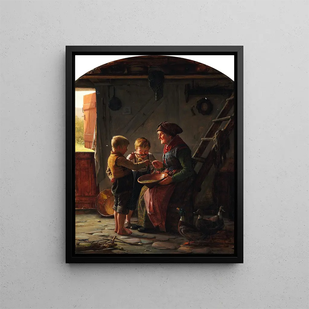Der Stil von Carl Bloch zeichnet sich durch seinen eindringlichen Realismus und seine Liebe zum Detail aus. In "Ein Essen" ist jedes Element, von den Gesichtern bis zur Kleidung, mit einer Präzision wiedergegeben, die seine technische Fertigkeit zeigt. Die Farben, sowohl lebhaft als auch nuanciert, verleihen der Szene eine spürbare Vitalität. Die Komposition ist sorgfältig orchestriert, jede Figur nimmt einen bedeutenden Platz im Gemälde ein, was das Gefühl von Harmonie und Gleichgewicht verstärkt. Bloch nutzt auch das Licht auf meisterhafte Weise, schafft Schatten und Reflexionen, die der Szene Tiefe verleihen. Dieses Spiel mit Licht und Schatten betont nicht nur die Ausdrücke der Figuren, sondern unterstreicht auch die Bedeutung des dargestellten Moments. So beschränkt sich "Ein Essen" nicht nur auf die Darstellung einer einfachen Alltagsszene; es ruft universelle Emotionen hervor, wie Freude, Solidarität und Teilen.