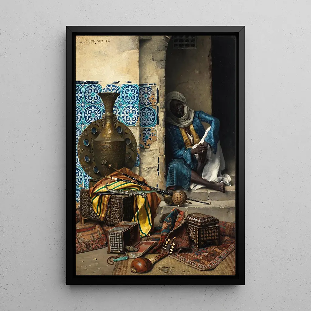 Dieser Kunstdruck von Ein Kunsthandelsmann ist ein dekoratives Stück, das jeden Raum bereichert, sei es ein Wohnzimmer, ein Büro oder eine Bibliothek. Seine Reproduktionsqualität garantiert eine detailgetreue Wiedergabe des Originalwerks und verleiht Ihrer Dekoration eine exotische und anspruchsvolle Note. Die ästhetische Anziehungskraft dieses Leinwandbildes, mit seinen leuchtenden Farben und feinen Details, macht es zur idealen Wahl für alle, die eine warme und inspirierende Atmosphäre schaffen möchten, während sie die Schönheit des orientalischen Kunststils feiern.