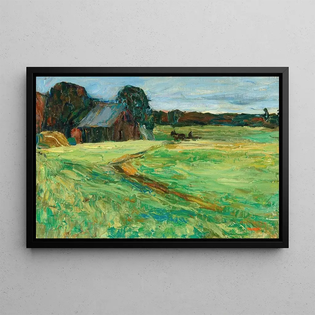 Vasilevsko Scheune mit Pony: eine Harmonie zwischen Mensch und Natur In "Vasilevsko Scheune mit Pony" taucht Wassily Kandinsky in eine Welt ein, in der Farbe und Form sich verflochten, um eine lebendige Atmosphäre zu schaffen. Die warmen, erdigen Töne vermitteln eine bucolische Gelassenheit, während sich geometrische und organische Formen vermengen, um die Szene zum Leben zu erwecken. Das Pony, Symbol für Freiheit und Verbindung zur Erde, steht stolz im Mittelpunkt dieser Komposition. Das Werk lädt zu einer tiefen Betrachtung ein, bei der jeder Pinselstrich eine Geschichte erzählt, ein Tanz zwischen Mensch und Natur, der die Schönheit einfacher Momente offenbart. Wassily Kandinsky: Pionier der Abstraktion und des Expressionismus Wassily Kandinsky, geboren 1866 in Russland, gilt oft als einer der Begründer der abstrakten Kunst. Beeinflusst vom expressionistischen Bewegung und den Theorien der Farbe, suchte er, Gefühle durch Formen und Farben auszudrücken. Sein Werk entwickelt sich im Laufe der Jahre, von figurativen Darstellungen zu völlig abstrakten Kompositionen. Kandinsky war auch ein Kunsttheoretiker, der einflussreiche Werke über Farbe und Form schrieb. "Vasilevsko Scheune mit Pony" zeugt von seinem Interesse an Natur und Spiritualität, wiederkehrende Themen in seinem Schaffen, die die Geschichte der modernen Kunst geprägt haben. Eine dekorative Reproduktion mit vielfältigen Vorzügen Die Reproduktion von "Vasilevsko Scheune mit Pony" ist ein dekoratives Stück, das Ihr Interieur bereichern wird, sei es im Wohnzimmer, Büro oder Schlafzimmer. Seine Palette warmer Farben und seine beruhigende Atmosphäre machen es zu einer idealen Wahl, um eine einladende Stimmung zu schaffen. Die Qualität der Reproduktion garantiert eine bemerkenswerte Treue zum Originalwerk, sodass Sie die ästhetische Anziehungskraft von Kandinsky genießen können, ohne den Stil Ihrer Dekoration zu beeinträchtigen. Durch das Hinzufügen dieses Bildes zu Ihrer Sammlung laden Sie nicht nur Kunst in Ihren Alltag ein, sondern auch eine Reflexion über die Beziehung zwischen Mensch und Natur.