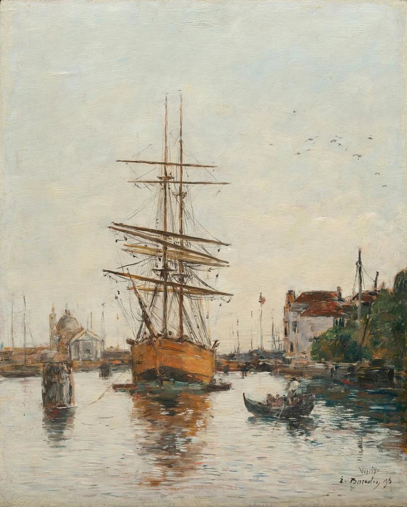 Boudin, oft als einer der Vorreiter des Impressionismus angesehen, gelingt es, die Magie Venedigs durch einen einzigartigen Stil zu übertragen. Seine Maltechnik, gekennzeichnet durch leichte, luftige Pinselstriche, verleiht dem Gesamtwerk eine fast greifbare Leichtigkeit. Die Reflexionen im Wasser, die Segel der Boote und die majestätischen Gebäude zeichnen sich durch eine Zartheit aus, die eine traumhafte Atmosphäre evoziert. Der Einsatz sanfter Farben, von Azurblau bis zu warmen Ockertönen, schafft einen harmonischen Kontrast, der die Schönheit der Szene unterstreicht. Dieses Werk beschränkt sich nicht nur auf die Darstellung eines Ortes; es fängt eine Emotion, ein Gefühl ein und macht jeden Blick zu einer sensorischen Reise.