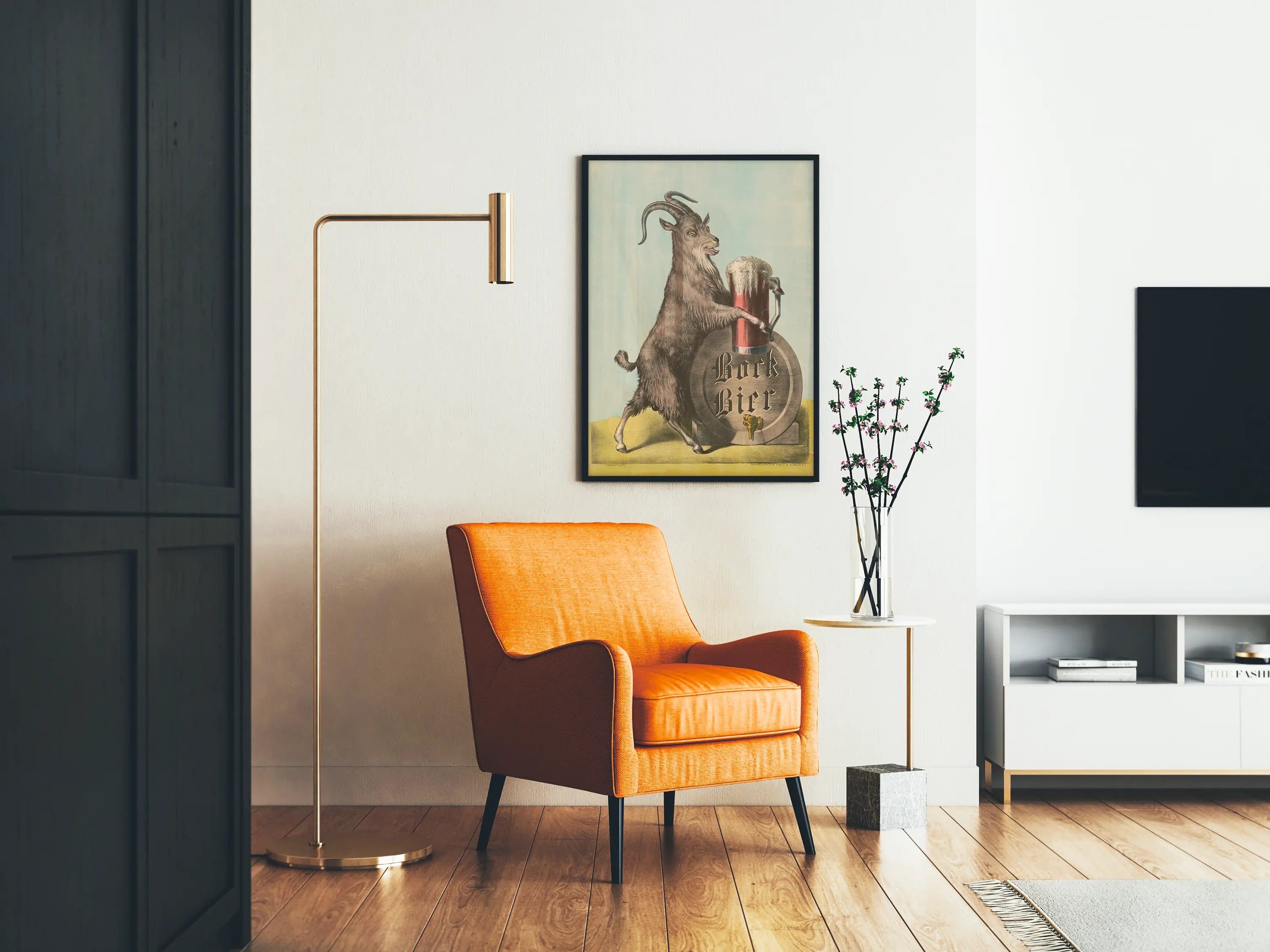 Entdecken Sie dieses Vintage-Poster, das eine originale Illustration der Marke Bock Bier zeigt, auf der eine stehende Ziege gegen ein Bierfass gelehnt ist. Dieses zeitlose Wanddekorationselement verbindet einen Retro-Stil mit einer gemütlichen Atmosphäre – perfekt für Bierliebhaber und Fans außergewöhnlicher Wandgestaltung. Das Motiv zeigt eine anthropomorphe Ziege, die ein großes, schäumendes Bierglas hält, vor einem Fass mit dem Schriftzug „Bock Bier“ in gotischen Buchstaben, was den nostalgischen Charme dieses Posters unterstreicht. Dieses sorgfältig gestaltete Wandbild mit sanften Farben, einem hellblauen Hintergrund und einem ockerfarbenen Boden ist ideal, um eine authentische Stimmung in einer Küche, Bar oder Esszimmer zu schaffen. Als Vintage-Wanddekoration passt es perfekt in ein industrielles, rustikales oder Retro-Ambiente und verleiht mit seiner humorvollen und symbolischen Illustration eine besondere Note. Dieses Poster lässt die Ästhetik alter Bierwerbung wiederaufleben und bringt eine warme, nostalgische Atmosphäre in Ihren Raum. Solch eine Wanddekoration ist die perfekte Wahl, um eine Wand mit einem bierbezogenen Motiv individuell zu gestalten oder eine Sammlung grafischer Objekte rund um Bier und Geselligkeit aufzubauen. Zusammengefasst ist dieses Bock Bier-Poster ein einzigartiges Dekorationselement, das durch seinen alten Stil und seine originelle Tierdarstellung besticht, Charakter verleiht und jedem Raum einen spielerischen Akzent setzt.