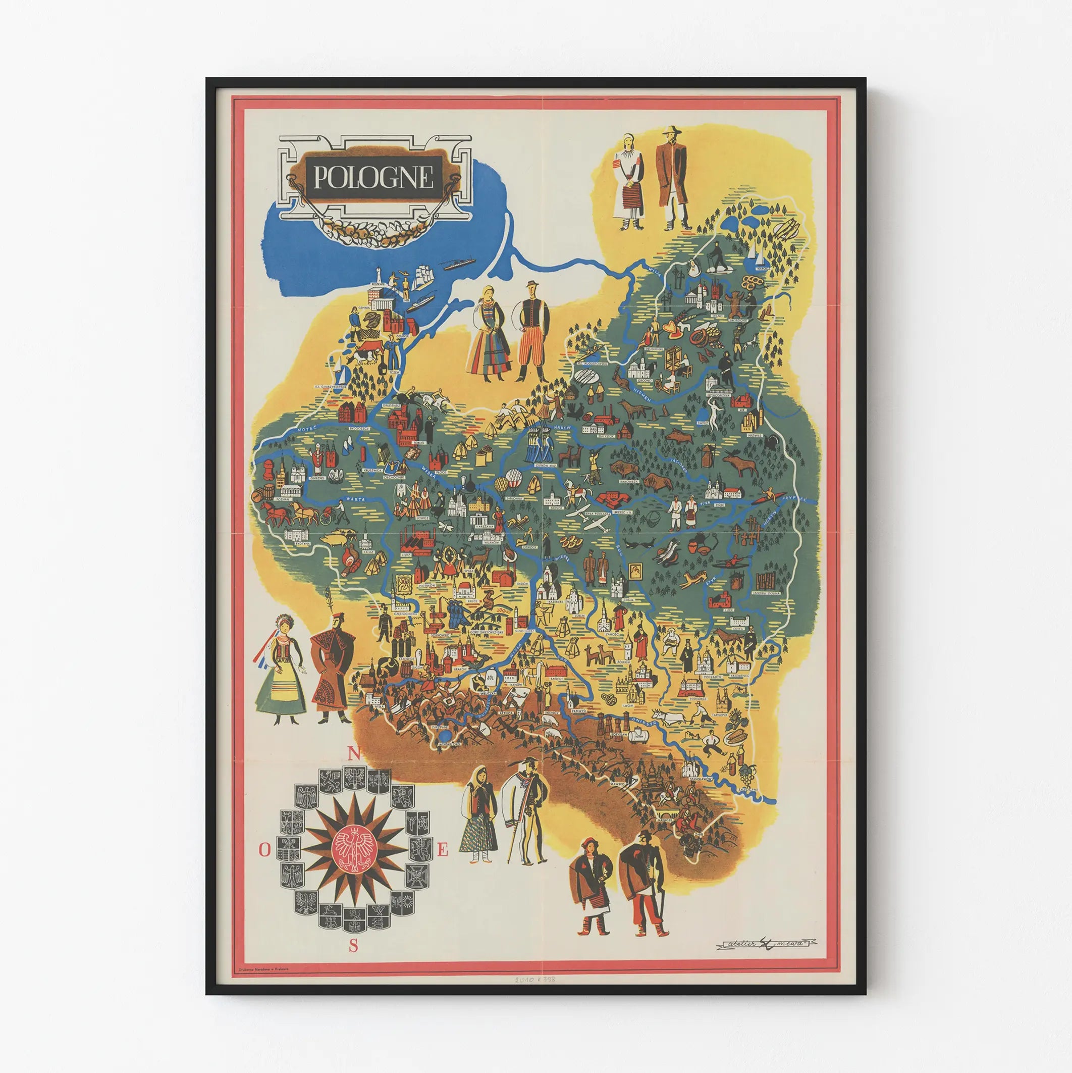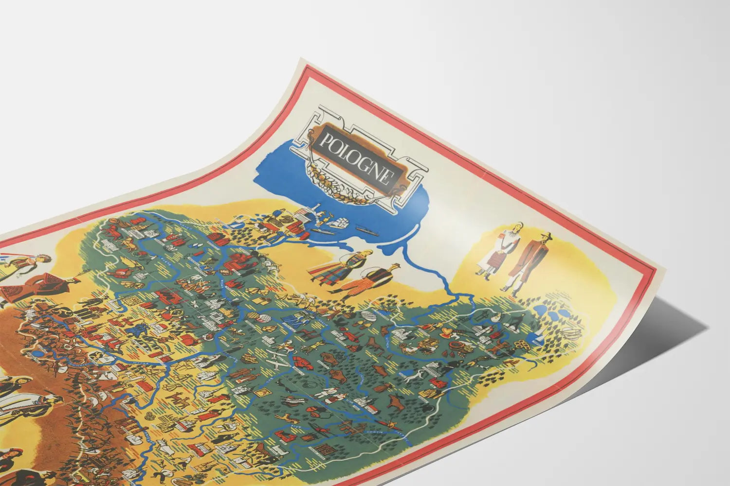 Dieses Wanddekorationplakat ist eine künstlerische und traditionelle Darstellung Polens, gestaltet in Form einer farbigen illustrierten Karte. Dieses Vintage-Poster bietet eine detaillierte und symbolische Ansicht des Landes mit grafischen Elementen, die sowohl die Geografie, das kulturelle Erbe als auch die lokalen Aktivitäten hervorrufen. Die Karte ist in verschiedene farbige Zonen unterteilt, die unterschiedliche Regionen abgrenzen, während Flüsse und die wichtigsten Städte durch ikonische Illustrationen hervorgehoben werden. Figuren in traditionellen Trachten, landwirtschaftliche und handwerkliche Szenen sowie regionale Symbole sind auf der Karte angeordnet, um die kulturelle und historische Vielfalt Polens zu illustrieren. Dieses Wandbild ist ideal für Dekorationsliebhaber, die ihrem Interieur eine Note von Authentizität und folkloristischem Charme verleihen möchten. Es kann als dekoratives Poster im Wohnzimmer, Büro oder Empfangsbereich verwendet werden, um Neugier auf polnische Traditionen zu wecken oder einfach als farbiges und originelles Wanddekorstück. Der Retro-Grafikstil und das Gleichgewicht der Farben – Blau, Gelb, Braun, Rot – verstärken den dekorativen Aspekt und betonen gleichzeitig die komplexen Details dieser bildhaften Karte. Insgesamt ist dieses Wandbild eine Einladung zu Reisen und kultureller Entdeckung durch ein ästhetisches Wandstück, das Liebhaber alter Karten und regionaler Geschichte begeistern wird.