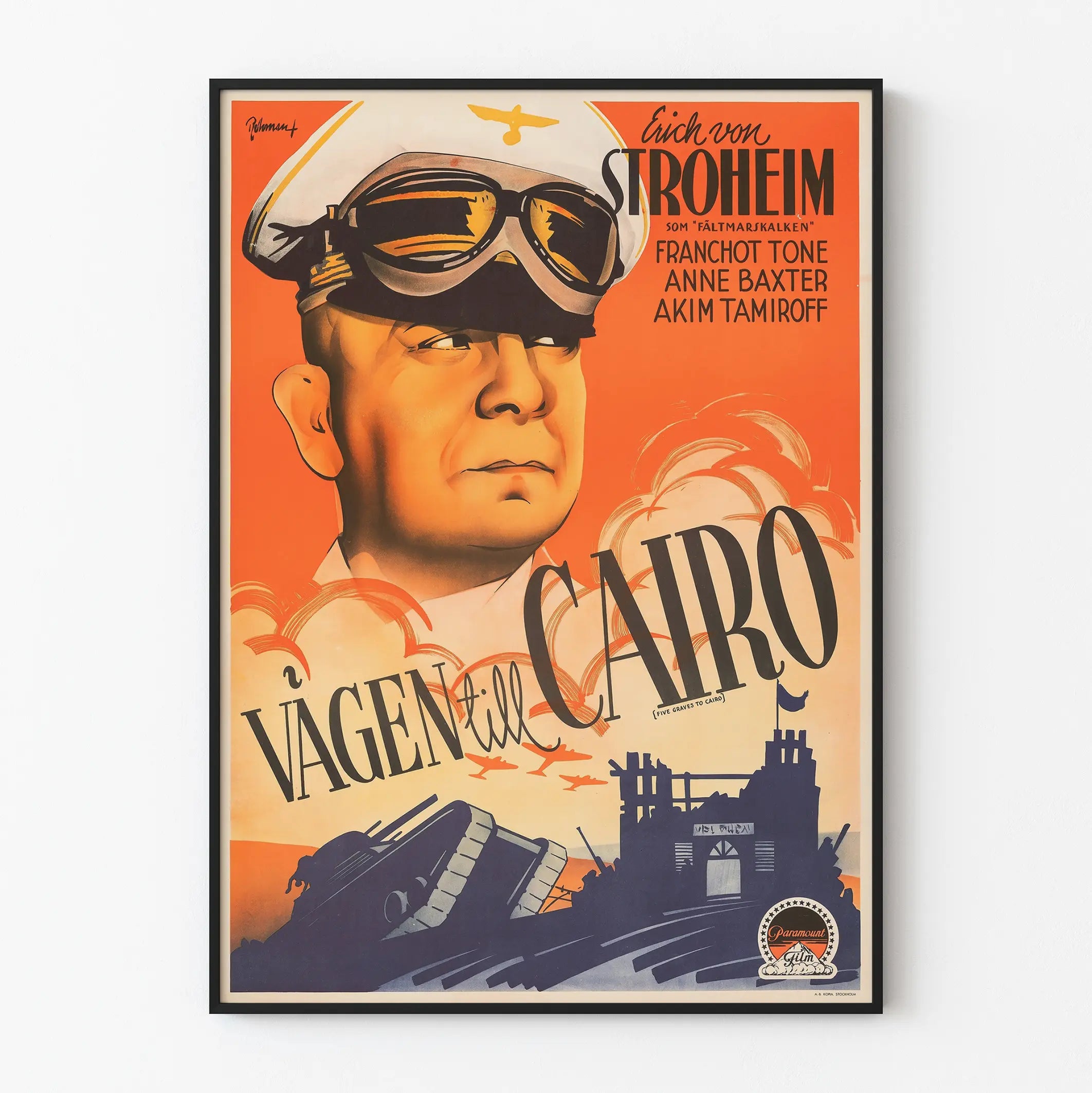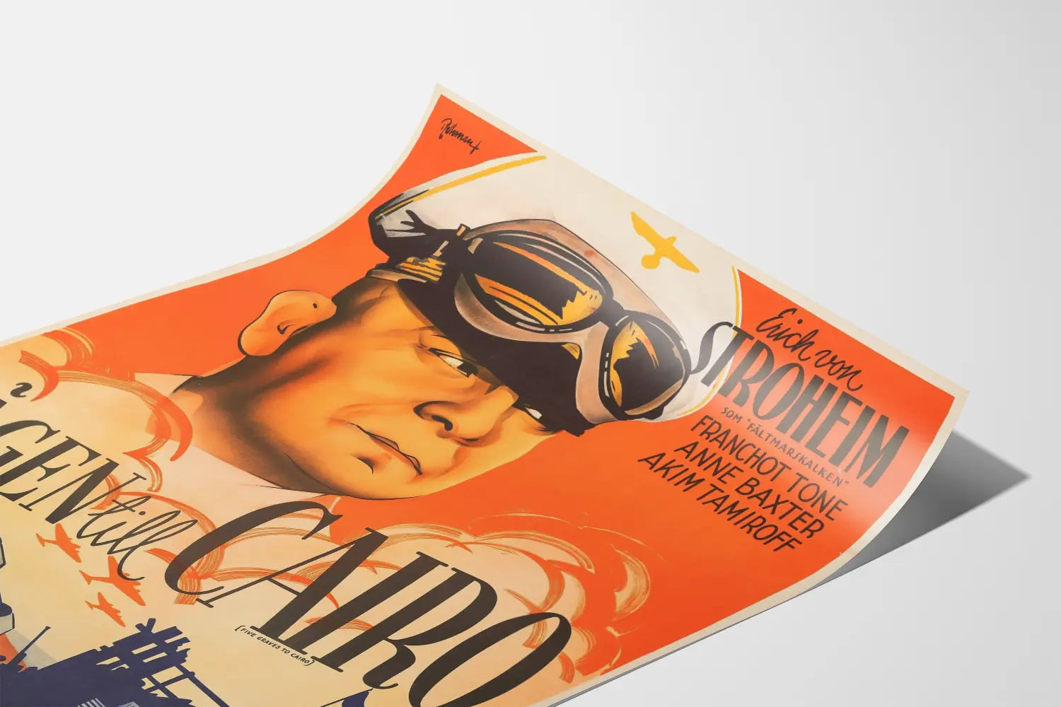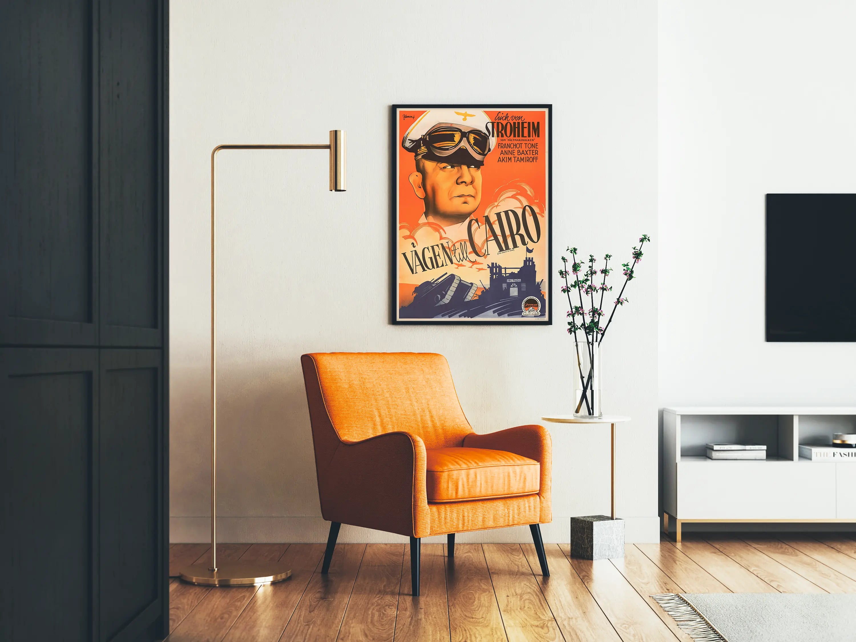 Dieses Vintage-Kinoposter mit dem Titel „Vägen till Cairo“ (Der Weg nach Kairo) ist eine Wanddekoration, die Liebhaber des klassischen Kinos und retroartiger Kunst begeistern wird. Dominierend durch einen lebhaften orangefarbenen Hintergrund, zeigt es ein ausdrucksstarkes Porträt eines Mannes in Uniform mit Helm und Pilotenbrille, ein kraftvolles Symbol, das die militärische Welt und heroische Abenteuer evoziert. Die grafische Komposition offenbart mehrere markante Elemente: eine Gruppe von drei dunklen Silhouetten von Panzern, formationierte Flugzeuge und zerfallene Gebäude, die einen Kriegskontext andeuten. Diese Motive verbinden sich zu einem tief dramatischen und dynamischen Effekt, der die Wandgestaltung in einem Wohnzimmer, Büro oder einem Raum für Kino oder Militärgeschichte bereichern kann.