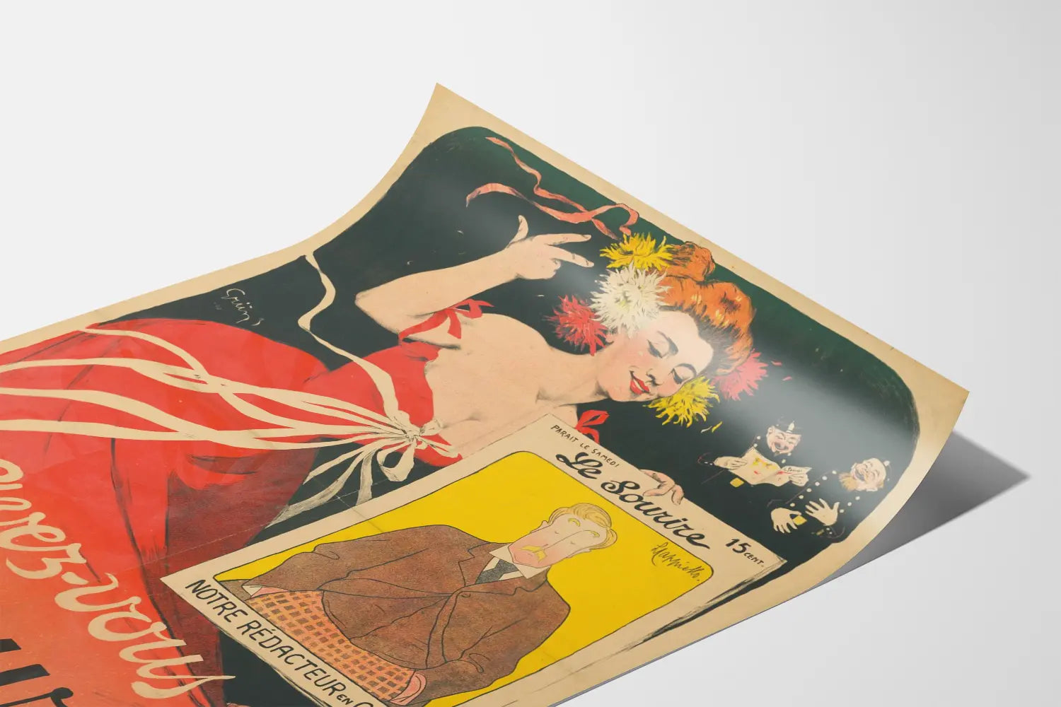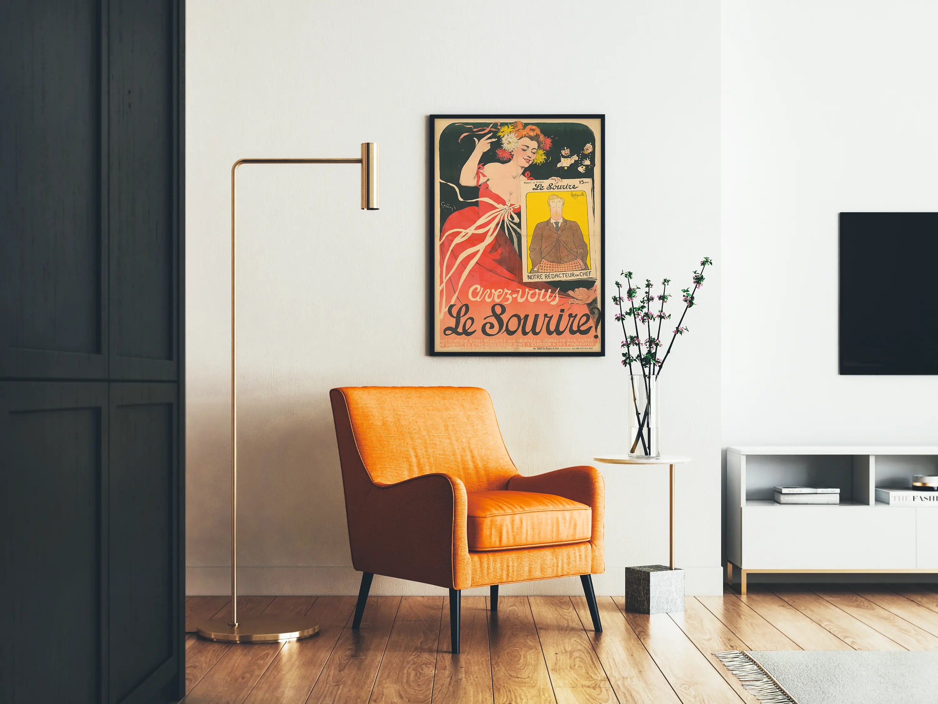 Dieses Vintage-Poster mit retroillustrativem Stil verleiht Ihrer Wanddekoration einen Hauch von Eleganz und historischem Charme. Es zeigt eine lächelnde Frau in einem leuchtend roten Kleid, verziert mit bunten Blumen, die mit einem humorvollen Spruch im Zusammenhang mit dem Lächeln posiert. Die grafischen Details sind im Jugendstil gehalten, typisch für das späte 19. und frühe 20. Jahrhundert, mit warmen Farbtönen und einem dunklen Hintergrund, der die zentrale Silhouette hervorhebt. Der handgeschriebene Text „Haben Sie das Lächeln?“ wird am unteren Rand des Posters hervorgehoben und schafft eine gelungene visuelle Balance. Dieses Poster kann als Dekorationsstück in einem Wohnzimmer, Büro oder einem anderen einladenden Raum verwendet werden, um eine Atmosphäre zugleich spielerisch und künstlerisch zu vermitteln. Das vertikale Format unterstreicht die elegante Haltung der Figur und den fröhlichen Ausdruck, den sie zeigt. Als Wanddekoration lädt dieses Plakat zu einem Moment der Leichtigkeit und guten Laune ein und erinnert an die Bedeutung des Lächelns im Alltag. Seine retro-vintage Ästhetik passt perfekt in ein klassisches oder eklektisches Dekor, das Altes und Zeitgenössisches verbindet. Dieses gedruckte Poster ist ideal für alle, die eine Prise Originalität und grafische Poesie suchen, während sie ein künstlerisches Andenken mit Fantasie und feinem Zeichnungsstil betonen. Eine perfekte Wahl, um Ihre Wände mit einem charaktervollen und humorvollen Kunstwerk zu personalisieren, typisch für die illustrierten Werbeanzeigen vergangener Zeiten.
