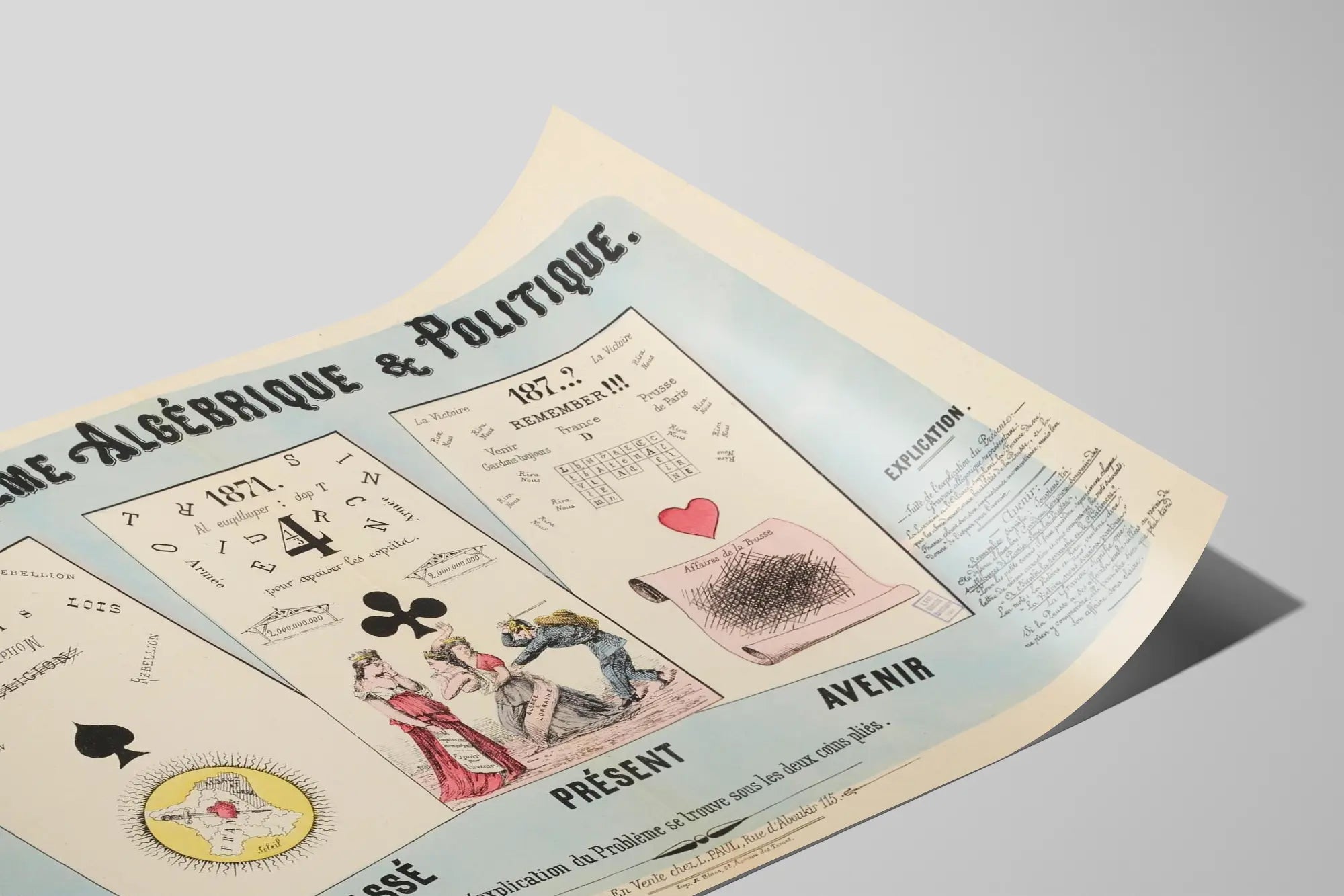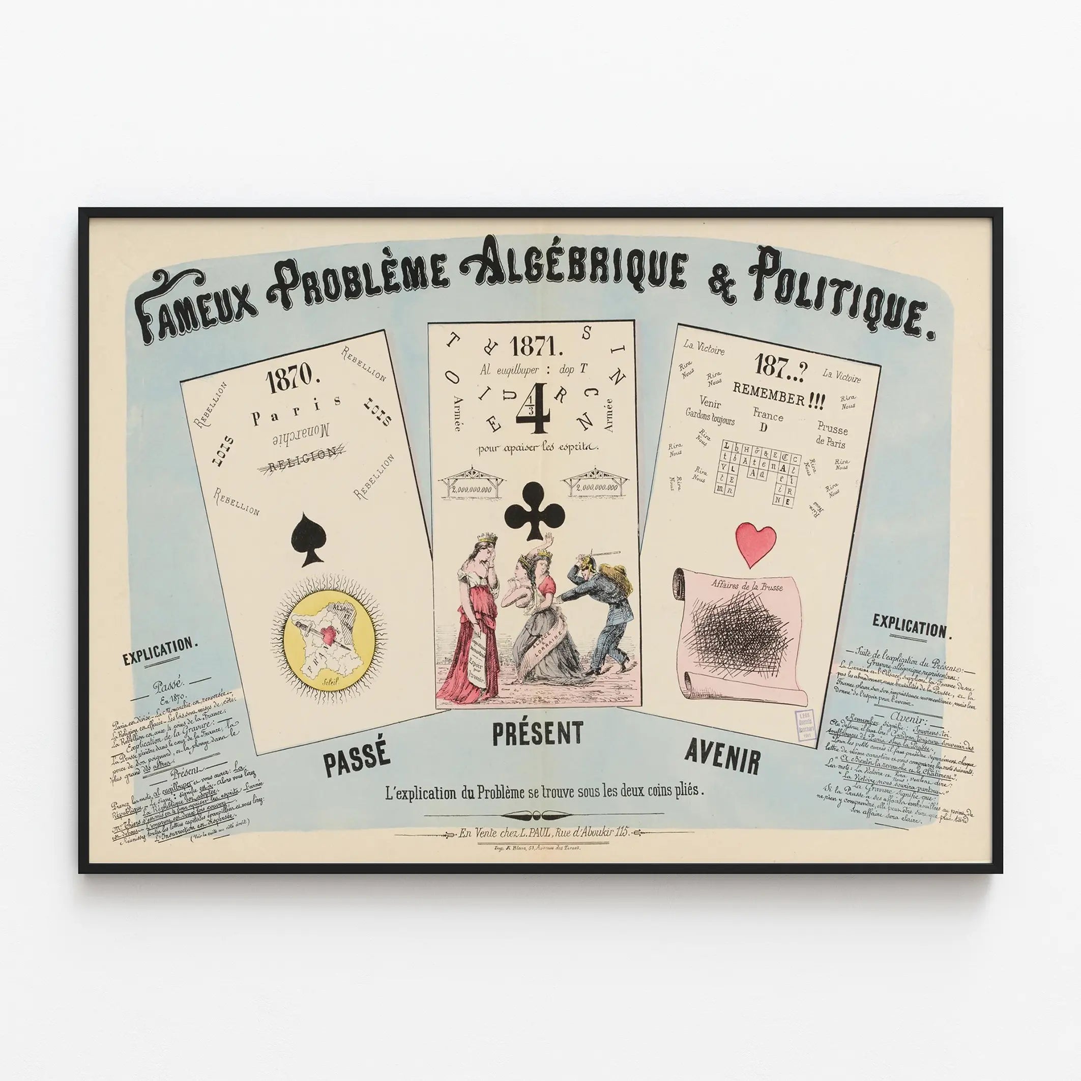 Entdecken Sie dieses Vintage-Poster mit dem Titel „Berühmtes Algebraisches & Politisches Problem“, eine einzigartige Wanddekoration, die Geschichte und Design mit einem Hauch kritischer Reflexion verbindet. Dieses Wandstück ist in drei thematische Bereiche unterteilt: Vergangenheit, Gegenwart und Zukunft, die symbolisch bedeutende politische Ereignisse rund um Frankreich am Übergang der 1870er Jahre darstellen. Jeder Abschnitt entspricht einer Spielkarte und verbindet Symbole wie Pik, Klee und Herz, die die Botschaft des Werkes durch eine originelle grafische Komposition verstärken.