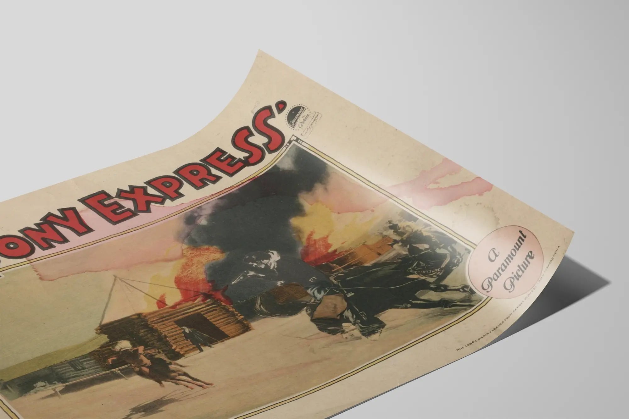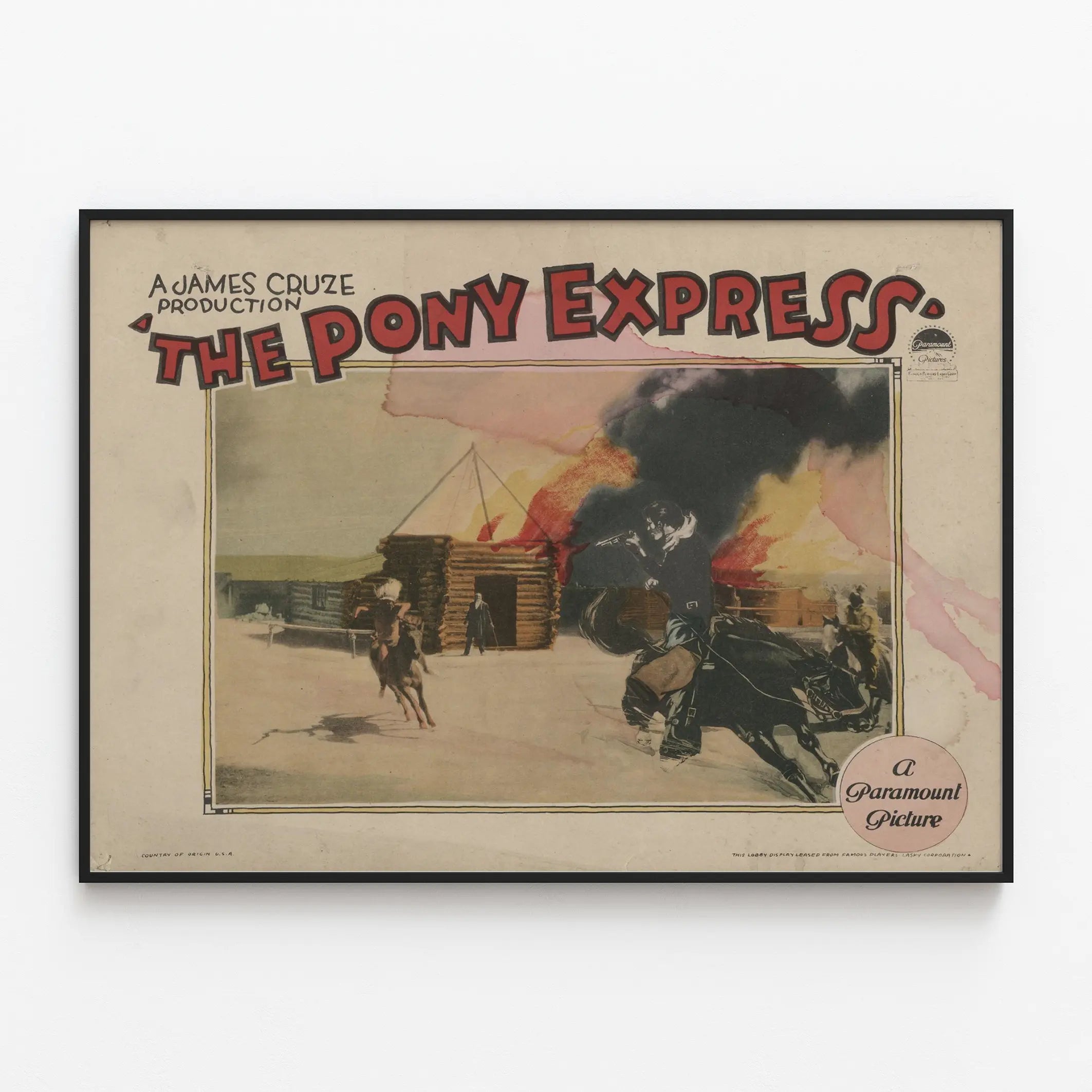 Entdecken Sie dieses Vintage-Poster mit dem Titel „The Pony Express“, produziert von James Cruze und veröffentlicht von Paramount Pictures. Dieses Plakat zeigt eine ikonische Szene des amerikanischen Wilden Westens, mit reitenden Cowboys in voller Aktion, einer hält eine Pistole, vor einer Kulisse aus Holzhütten und schwarzem Rauch eines Feuers. Diese Wanddekoration vermittelt sowohl den abenteuerlichen Geist als auch die Legende des Pony Express, eines berühmten schnellen Postdienstes im 19. Jahrhundert in den Vereinigten Staaten. Perfekt für Liebhaber klassischer Filme oder westernbezogener Themen, verleiht dieses Poster Ihrem Raum eine authentische und nostalgische Note. Sein leicht sepiafarbener Ton, mit Akzenten in Rot und Schwarz, bringt einen alten Charme und eine dramatische Atmosphäre in Ihr Zuhause. Ob für einen Kinoraum, ein Wohnzimmer oder ein Büro, dieses Wandposter passt perfekt zu einem Retro-, Vintage- oder Western-Themenstil. Neben seiner dekorativen Wirkung wird dieses Poster zum echten Blickfang, der Neugier weckt und den Dialog über die kulturelle Vielfalt Amerikas und seine legendären Geschichten fördert. Leicht einzurahmen, ist dieses klassische Wandposter ein unverzichtbares Stück, um Ihre Sammlung origineller Wanddekorationen mit Geschichte zu bereichern.