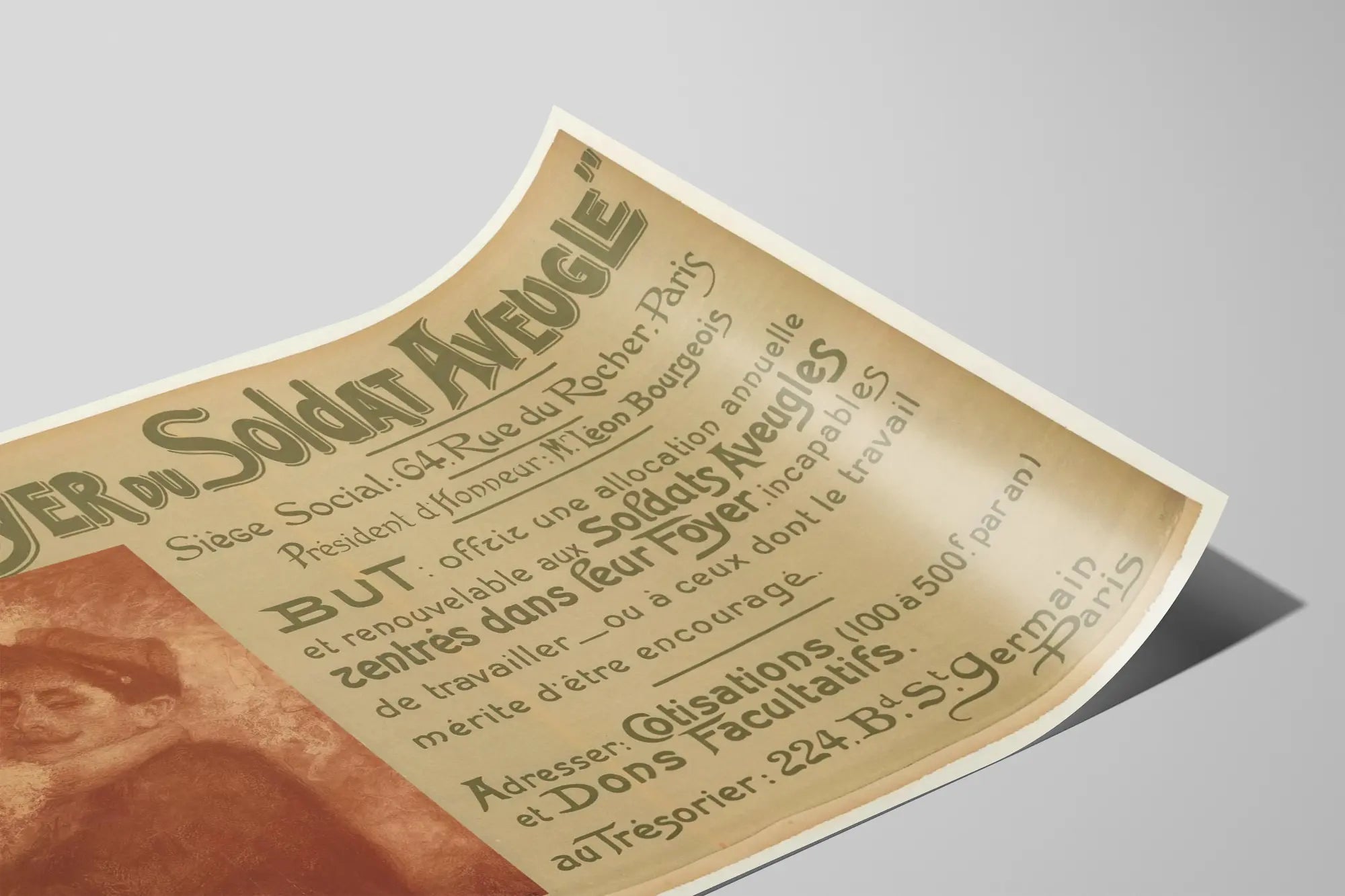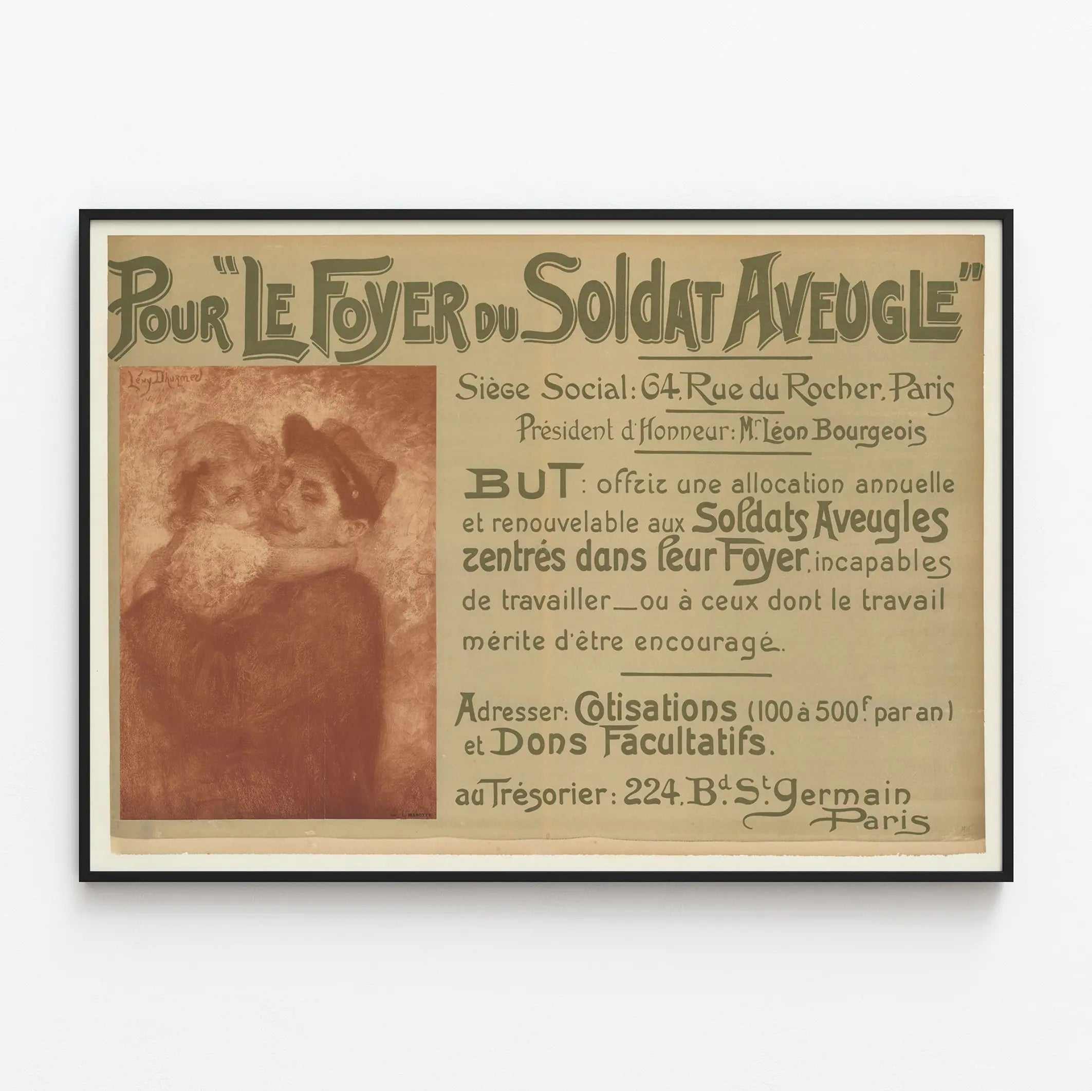 Der informative Text beschreibt den Zweck der Kampagne: eine jährliche Unterstützung für blinde Soldaten zu bieten, die nicht arbeiten können oder deren Arbeit gefördert werden sollte. Das Poster erwähnt auch Kontaktadressen in Paris, was seine Authentizität und karitative Ausrichtung unterstreicht. Dieses Plakat passt ideal in eine Inneneinrichtung, die das visuelle Erbe und historische Anliegen wertschätzt.
