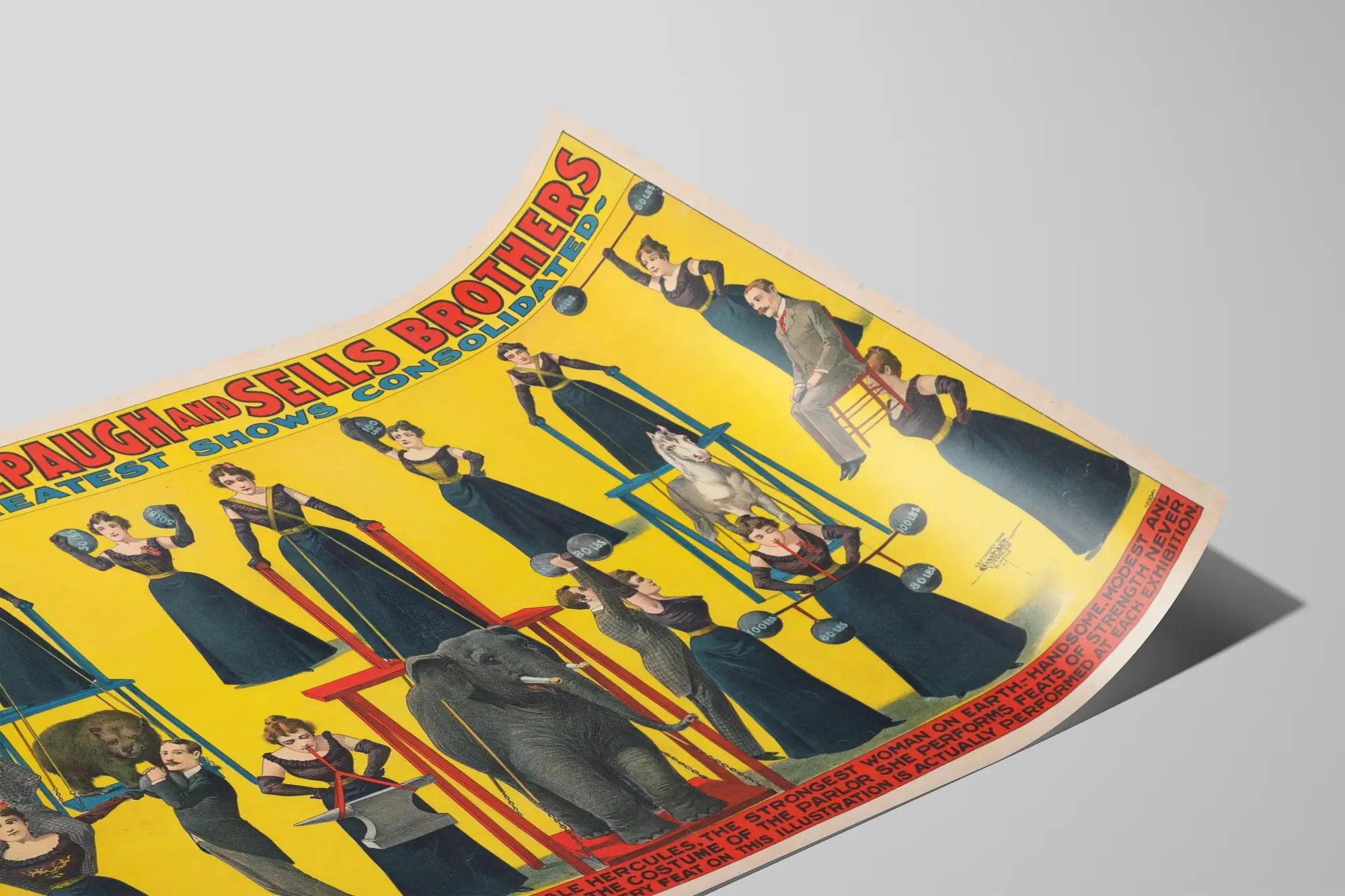 Dieses bemerkenswerte Vintage-Poster zeigt Madame Yucca, auch bekannt als „Die weibliche Herkules“, die als die stärkste Frau der Welt gilt. Diese farbenfrohe und detailreiche Illustration fängt den spektakulären Geist vergangener amerikanischer Shows ein, in denen Madame Yucca in mehreren beeindruckenden Kraftakten dargestellt wird. Perfekt für eine einzigartige Wanddekoration verbindet dieses Retro-Poster lebendige Grafiken auf gelbem Hintergrund mit einer Reihe dynamischer Posen, in denen Madame Yucca Gewichte hebt, Tiere wie Bären und Elefanten, und verschiedene körperliche Darbietungen zeigt. Dieses Plakat erinnert an die Welt der Jahrmärkte und Volksfeste des 19. Jahrhunderts, bei denen Kraftdemonstrationen sowohl Unterhaltung als auch Symbol außergewöhnlicher Stärke waren. Die zahlreichen Szenen auf diesem Poster, mit den Gewichten in Pfund angegeben, unterstreichen die außergewöhnliche Kraft von Madame Yucca, während ihre eleganten Kostüme ihr eine bescheidene und distinguierte Ausstrahlung verleihen. Ideal für Liebhaber ungewöhnlicher und Vintage-Wanddekorationen bringt dieses gedruckte Bild einen Hauch Geschichte und Mut in jeden Raum. Ob im Wohnzimmer, Büro oder in einem Bereich für die Sammlung volkstümlicher Kunst, dieses Poster dient sowohl als starkes grafisches Element als auch als visuelle Erzählung. Die Qualität der Illustration, mit ihren kontrastreichen Farben und sorgfältigen Details, bereichert dieses Dekorationsobjekt und macht es ebenso ansprechend wie lehrreich. Die Referenz an die berühmten Veranstalter Adam Forepaugh und Sells Brothers verankert dieses Poster in einem historischen Kontext der Unterhaltung. Insgesamt ist dieses vintage Dekorationsposter Madame Yucca ein faszinierendes Stück, das die weibliche Kraft durch einen typischen grafischen Stil des späten 19. Jahrhunderts feiert – perfekt für alle, die ihrem Raum ein dekoratives Element mit Geschichte und Energie hinzufügen möchten.