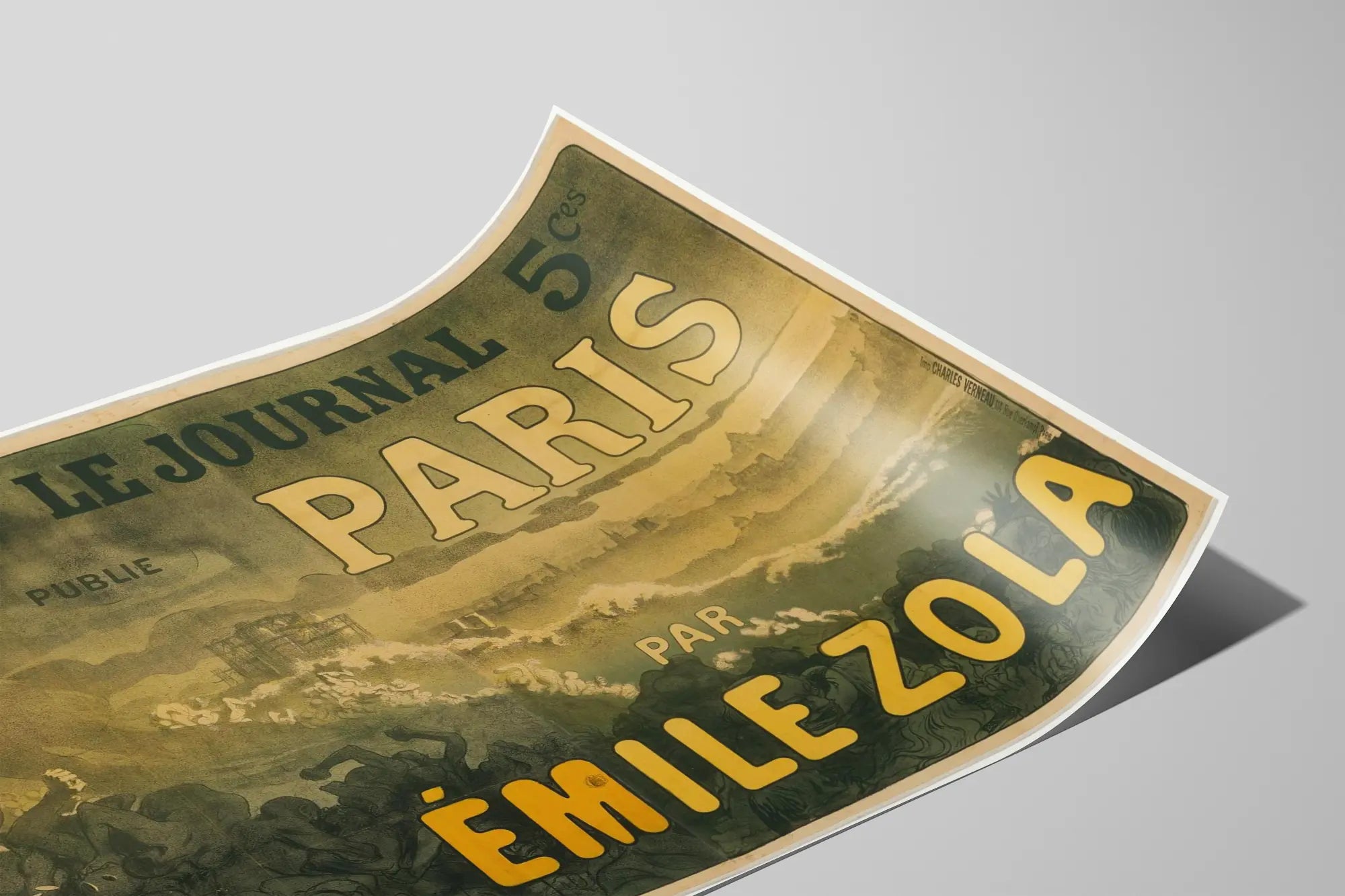 Entdecken Sie dieses Vintage-Poster „Paris von Émile Zola“, ein einzigartiges Stück, um Ihre Wanddekoration mit einem literarischen und künstlerischen Akzent zu bereichern. Dieses Werbeplakat zeigt einen alten grafischen Stil, typisch für Zeitungsillustrationen, mit einer Farbpalette, die von Grüntönen, Gelb und Schwarz dominiert wird und eine Atmosphäre von Geheimnis und Dramatik schafft. Das Poster hebt den Namen Émile Zola hervor, den berühmten französischen Schriftsteller, und verweist auf eine Verbindung zur Stadt Paris. Die figürlichen Illustrationen zeigen bewegte Silhouetten von Menschen, begleitet von einer leuchtenden Frauenfigur oben links, was eine Szene voller Emotionen und Dynamik andeutet – ideal für ein Interieur, das Kultur, Geschichte und Ästhetik vereinen möchte. Die breite, markante Schrift verstärkt die visuelle Wirkung dieser Vintage-Wanddekoration und sorgt für einen eindrucksvollen Effekt, der in jedem Raum Aufmerksamkeit erregen wird. Dieses Poster ist perfekt für Liebhaber französischer Literatur, Retro-Dekoration oder für jene, die ihre Wände mit einem bedeutungsvollen und geschichtsträchtigen Kunstwerk schmücken möchten. Ob im Wohnzimmer, Büro oder in einer Bibliothek – dieses Bild verleiht eine authentische und einzigartige Atmosphäre und erinnert an die Zeit, in der Presse und Literatur eine zentrale Rolle im kulturellen Leben Paris’ spielten. Integrieren Sie diese Wanddekoration, um Ihrer Einrichtung eine echte Persönlichkeit zu verleihen und gleichzeitig das Erbe Émile Zolas sowie den zeitlosen Charme von Paris zu würdigen.