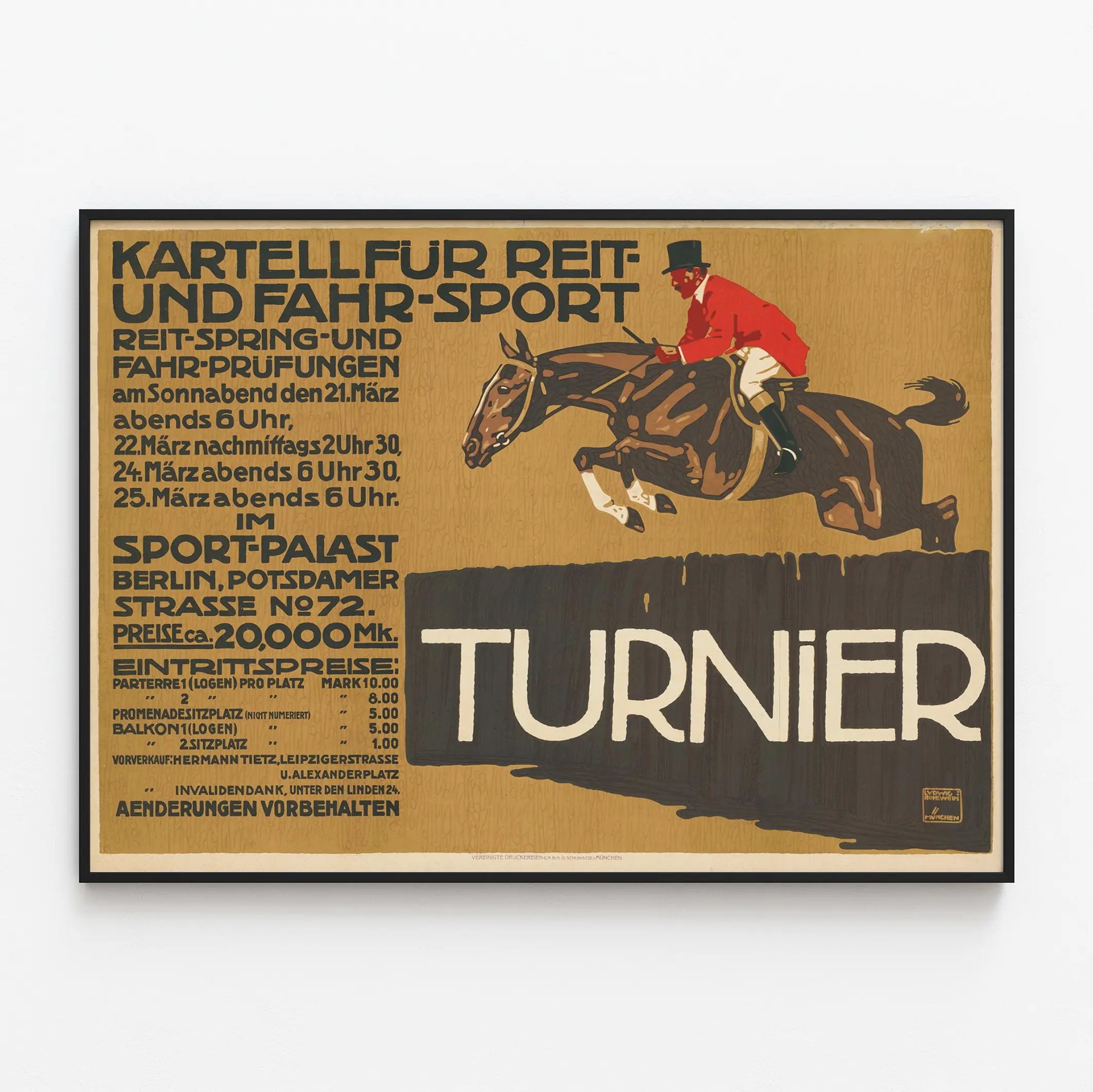Entdecken Sie dieses vintage Poster, das dem Pferdesportturnier gewidmet ist und eine dynamische Szene des Springreitens zeigt. Dieses Wanddekoration-Poster zeigt einen Reiter in traditioneller roter und weißer Kleidung, der einen Zylinder trägt, beim Springen mit seinem braunen Pferd. Der Hintergrund ist beige mit einem dezenten Muster und hebt den Text in schwarzen und weißen Großbuchstaben hervor, der die Informationen zum Reit- und Fahrturnier detailliert. Diese sportlich inspirierte Wanddekoration vereint Eleganz und Dynamik. Die schwarzen Schriftzeichen bilden einen Kontrast zu dem warmen Farbton des Hintergrunds und heben die Daten und Orte des Turniers sowie praktische Informationen wie Preise und Adressen hervor. Dieses Poster ist ideal für Liebhaber von Vintage-Kunst und origineller Wanddekoration und verleiht jedem Raum einen retro- und sportlichen Akzent. Hochwertiges Poster, das den Geist und die Atmosphäre vergangener Pferdesportveranstaltungen einfängt – perfekt, um eine Sammlung von Postern zu bereichern oder eine Wand mit historischem Flair zu gestalten. Dieses vintage Wandbild findet seinen Platz im Wohnzimmer, Büro oder in einem Raum für Pferdesportleidenschaft und ist ein dekoratives Element, das sowohl visuell als auch informativ ist.
