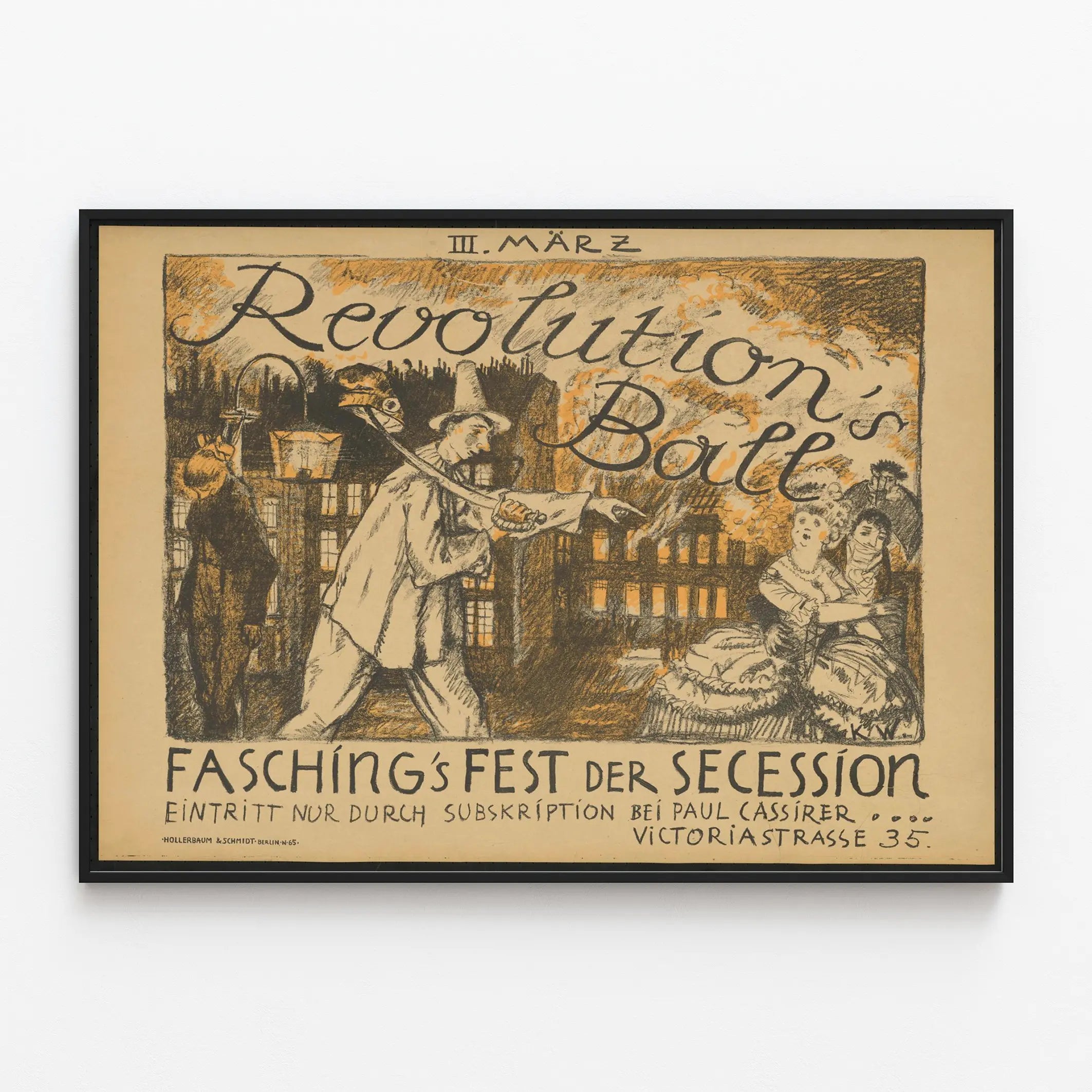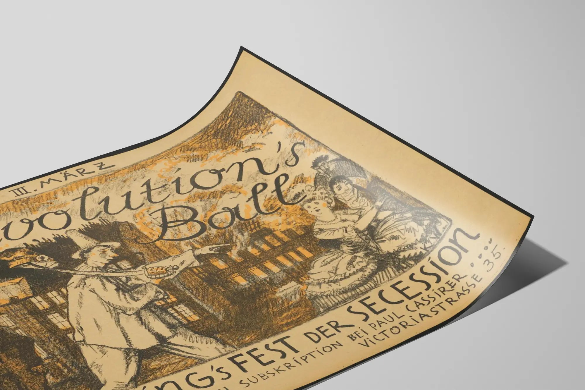 Entdecken Sie dieses Vintage-Poster mit einzigartigem Stil, perfekt für eine originelle Wanddekoration. Unter dem Titel „Revolution's Ball“ erinnert dieses Plakat an einen Karnevalsball unter dem Namen „Faschings Fest der Secession“. Die Illustration, in dominanten Schwarz- und Orangetönen gehalten, zeigt eine intensive Szene, in der eine Figur in charakteristischer Kleidung auf ein elegantes Paar zeigt, vor einer urbanen Kulisse, die von Flammen und revolutionärer Atmosphäre geprägt ist. Dieses Poster verbindet Geschichte und Kunst und bietet eine retro-dramatische Ästhetik, die sich nahtlos in jeden Raum einfügt, der eine starke künstlerische und kulturelle Note sucht. Ideal für Liebhaber thematischer Wanddekorationen, kann dieses Druckbild auch eine Ausstellungswand, ein Wohnzimmer oder ein Büro bereichern und Tiefe sowie Charakter verleihen. Ob Sie Sammler historischer Plakate sind oder sich für Vintage-Dekoration begeistern, dieses Poster präsentiert sich als ein ansprechendes und eindrucksvolles Dekorationselement.