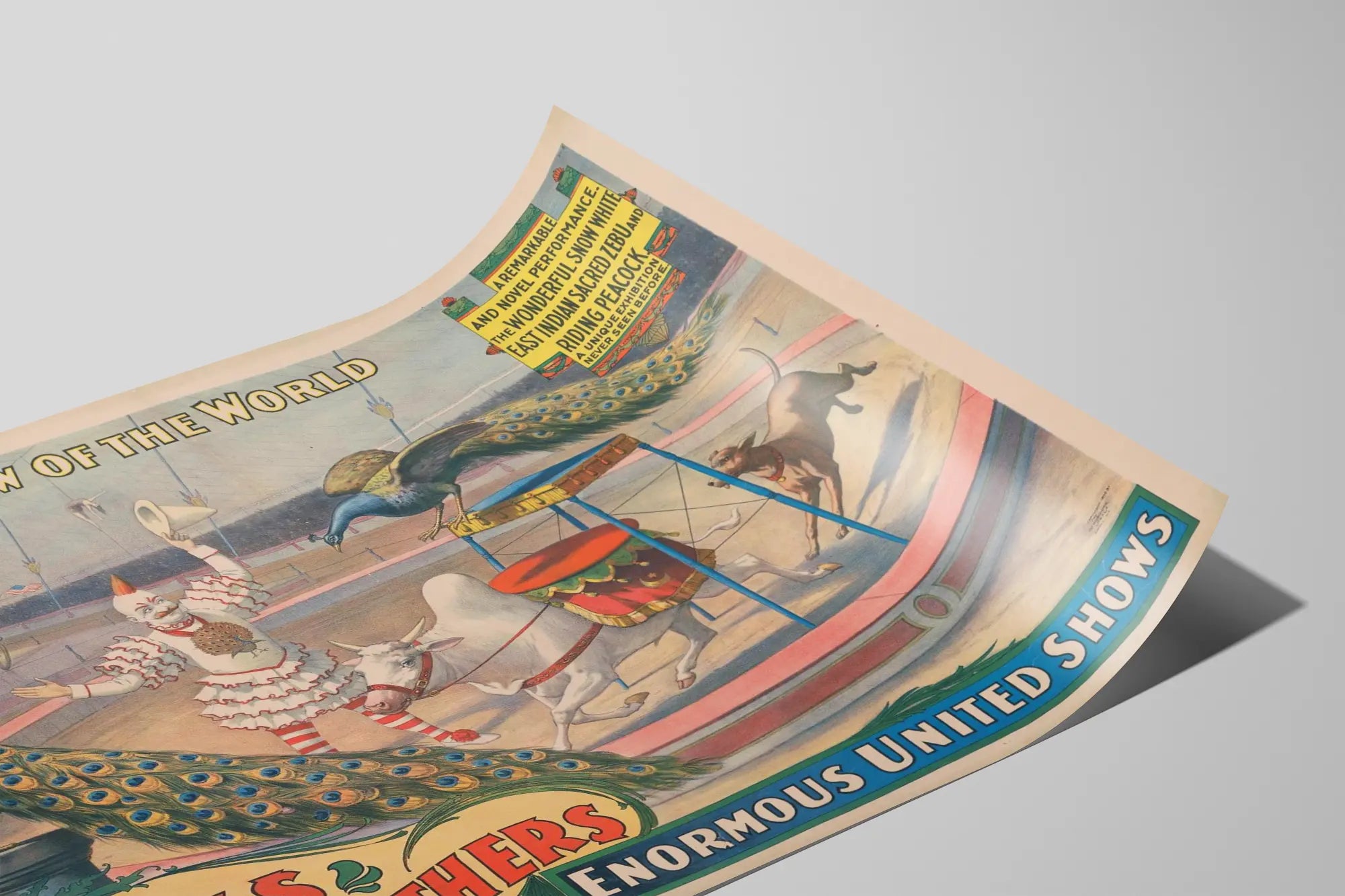 Dieses vintage Werbeplakat der "Sells Brothers Enormous United Shows" ist ein beeindruckendes Beispiel für Retro-Wanddekoration. Es zeigt "The Big Show of the World" und inszeniert einen erstaunlichen Zirkus, in dem ein heiliger weißer Zebu aus Ostindien, ein majestätischer Pfau auf einer Konstruktion und ein Clown in Kostüm mit theatralischer Inszenierung die Aufmerksamkeit fesseln. Jedes Detail ist fein illustriert: der lange, bunte Schwanz des Pfaus, die detaillierte Textur des weißen Fells des Zebus und das ausdrucksstarke Lächeln des Clowns. Dieses Plakat, zugleich festlich und originell, ist ideal für eine Wanddekoration, die einen Hauch von Geschichte und Exotik vermittelt. Perfekt für Liebhaber retroer Poster, wird es diejenigen begeistern, die ihrem Interieur ein einzigartiges Element hinzufügen möchten. Der große Schriftzug hebt die Neuheit und Einzigartigkeit dieser noch nie zuvor gesehenen Show hervor und unterstreicht die anziehende Wirkung des Motivs. Ob im Wohnzimmer, Spielraum oder in einem Bereich für Zirkus und Darstellende Künste – dieses Poster erweckt den Geist der fahrenden Show und das Staunen, das sie hervorruft.