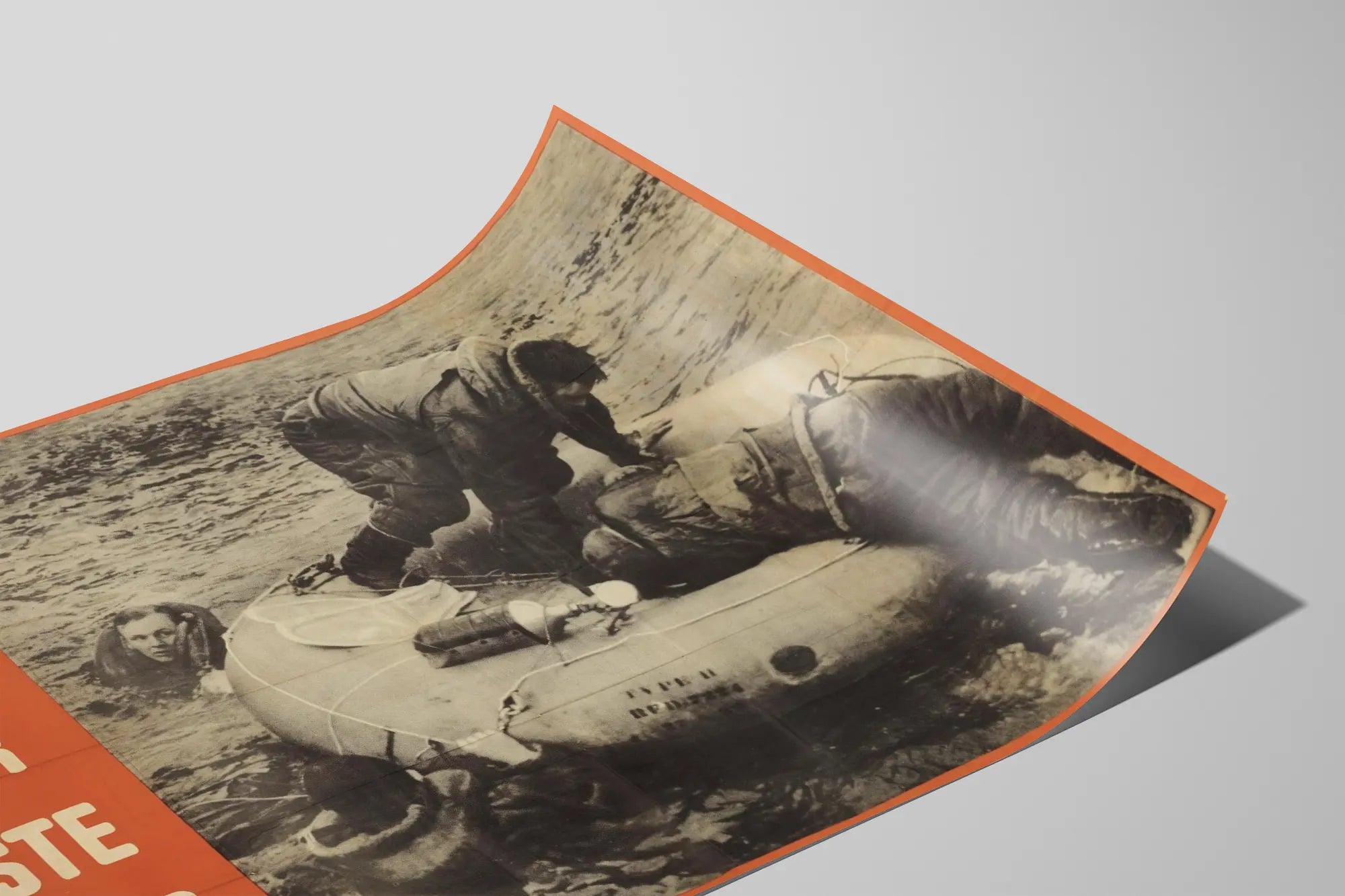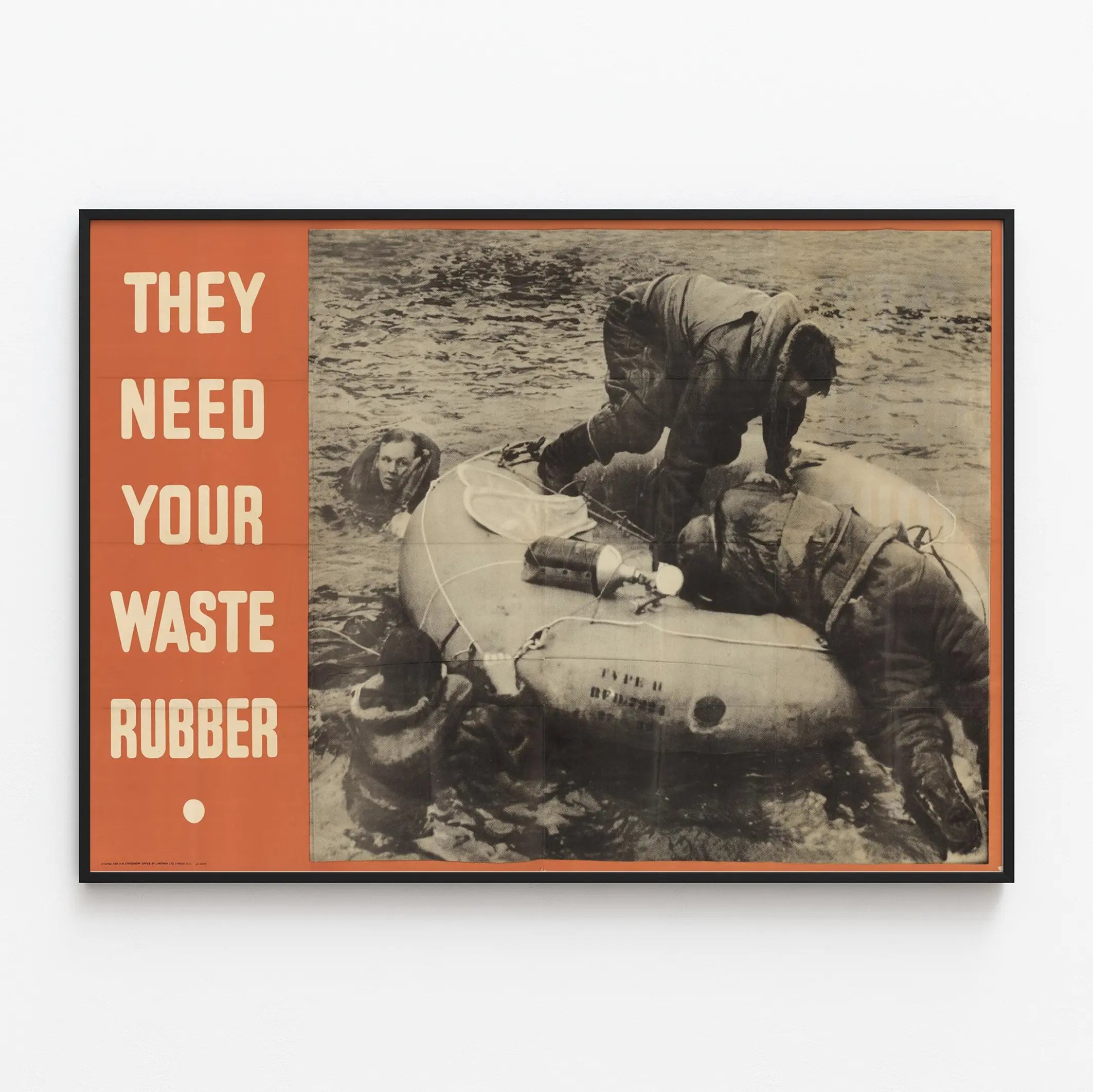 Entdecken Sie dieses Vintage-Poster im Retro-Stil mit dem Titel „They Need Your Waste Rubber“, perfekt, um Ihrer Wanddekoration eine Note von Authentizität und Geschichte zu verleihen. Dieses Plakat zeigt eine Schwarz-Weiß-Szene, in der Personen in schwerer Kleidung ein aufblasbares Floß auf einem Wasserbecken bedienen, wodurch eine immersive und realistische Atmosphäre entsteht. Links im Bild hebt ein leuchtend orangefarbener Rahmen eine starke Botschaft hervor, geschrieben in weißen Großbuchstaben: „They Need Your Waste Rubber“.